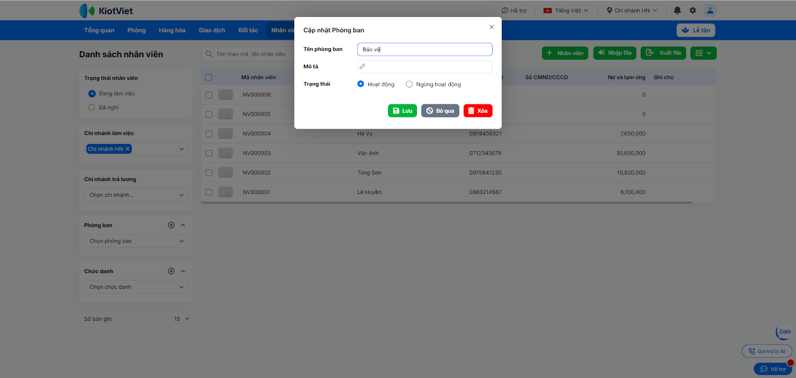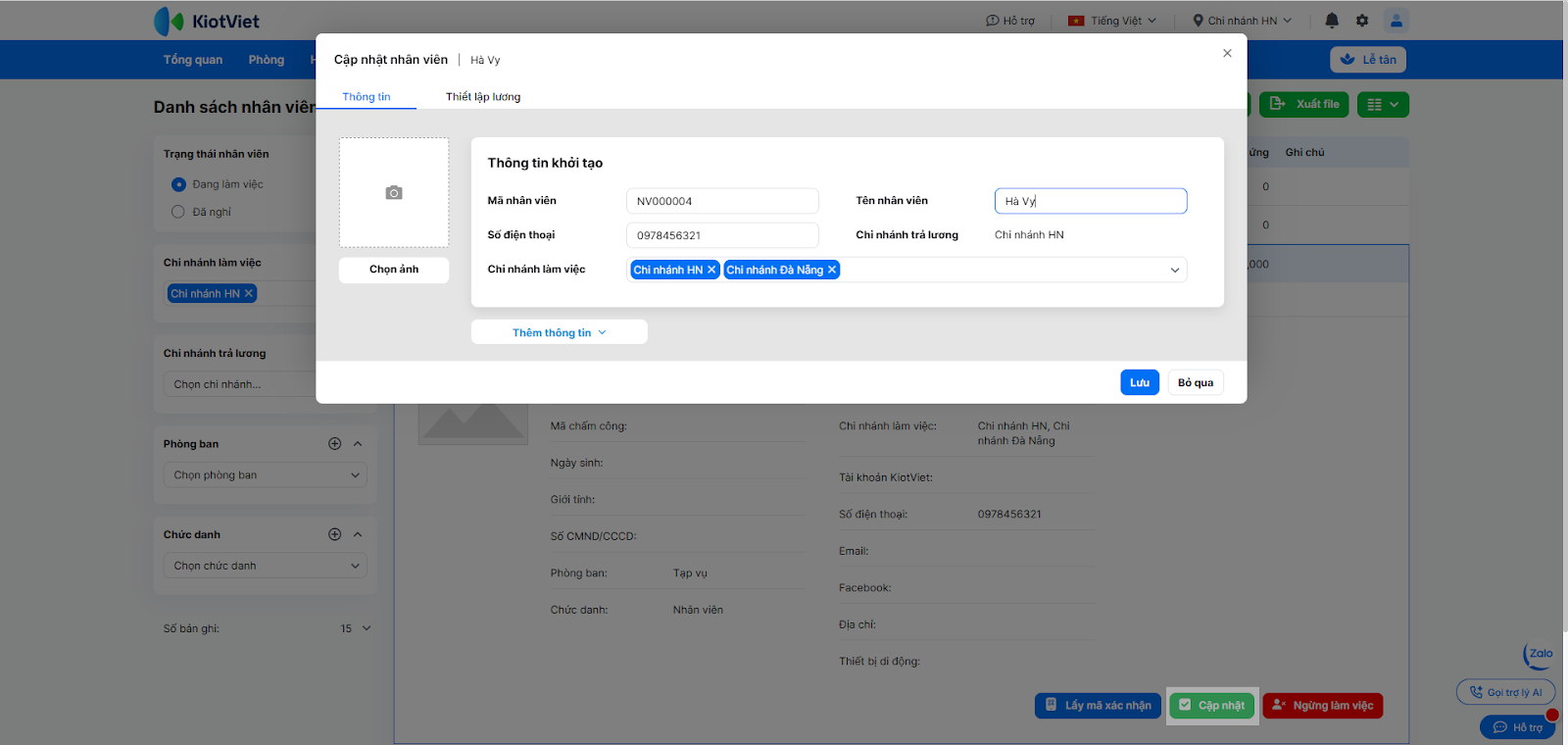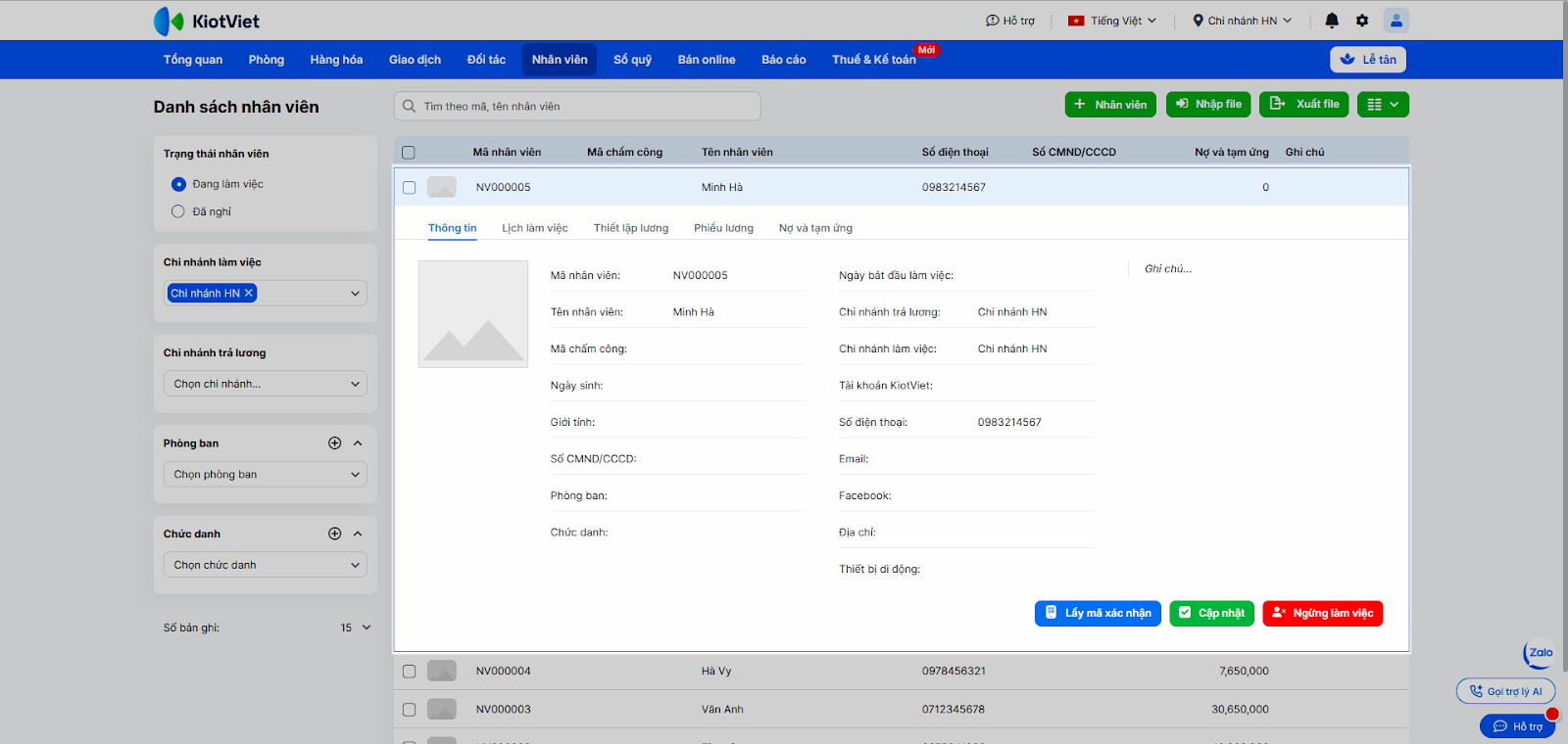 - Nhấn vào dòng tên nhân viên để xem chi tiết hồ sơ cá nhân, lịch sử giao dịch hoặc chọn Cập nhật/Ngừng làm việc.