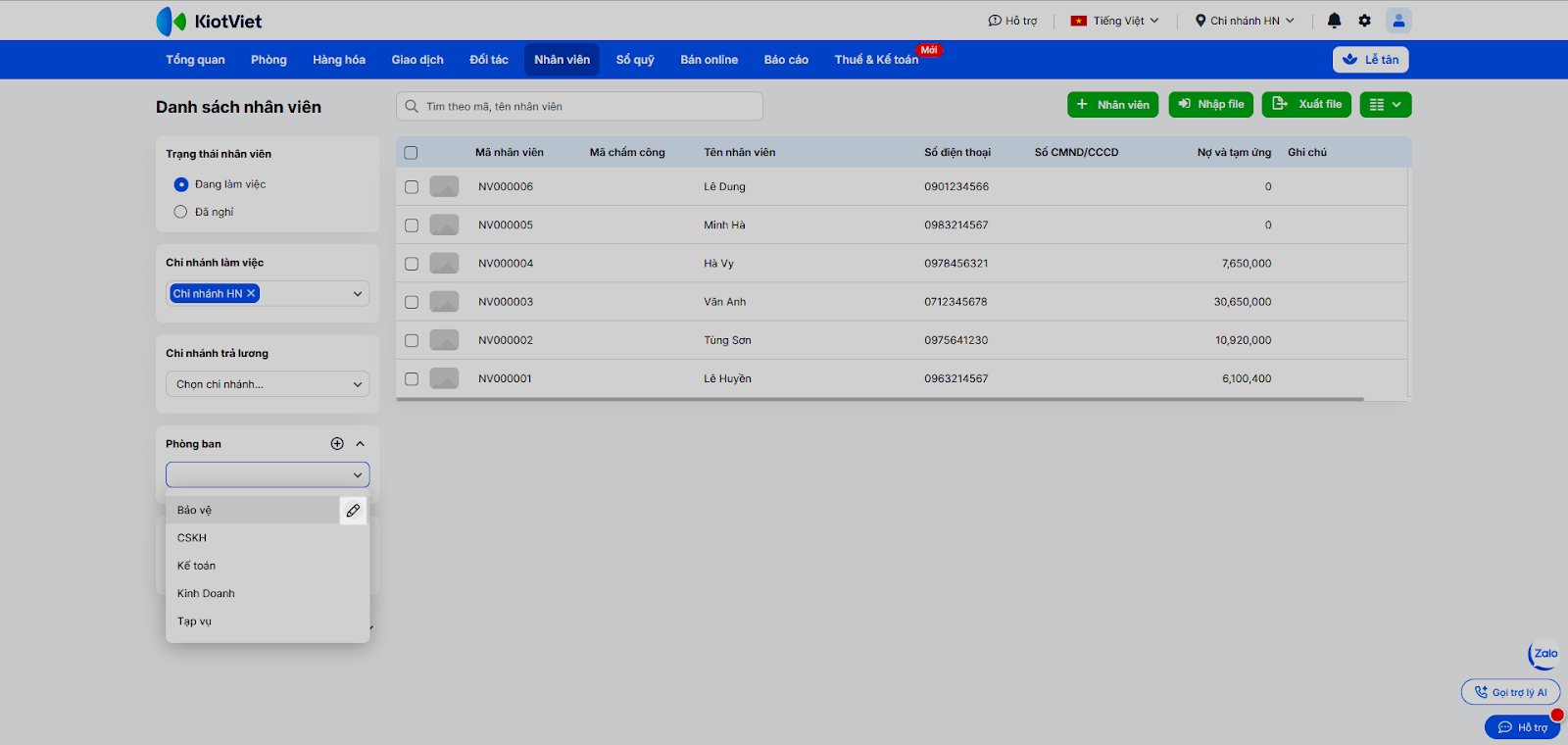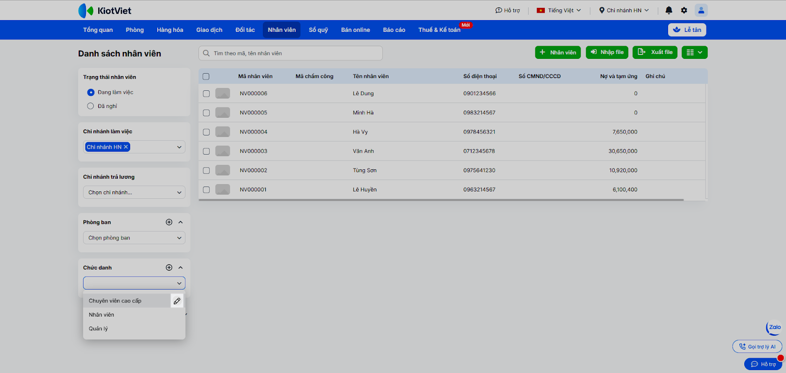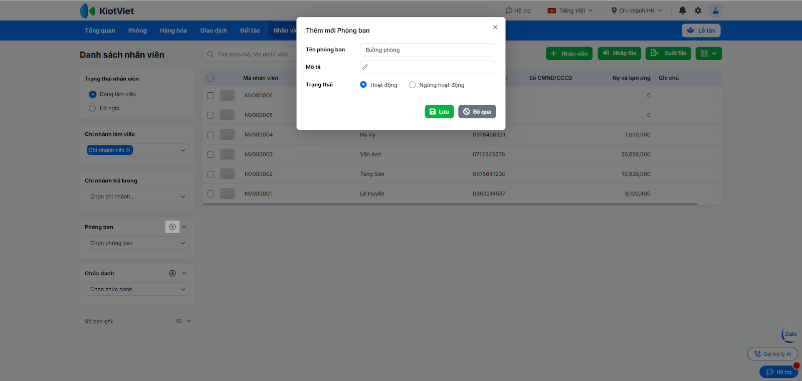 - Nhấn vào dòng tên nhân viên để xem chi tiết hồ sơ cá nhân, lịch sử giao dịch hoặc chọn Cập nhật/Ngừng làm việc.