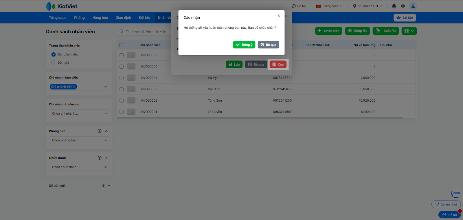 - Để xóa phòng ban → chọn Xóa → xác nhận Đồng ý.
