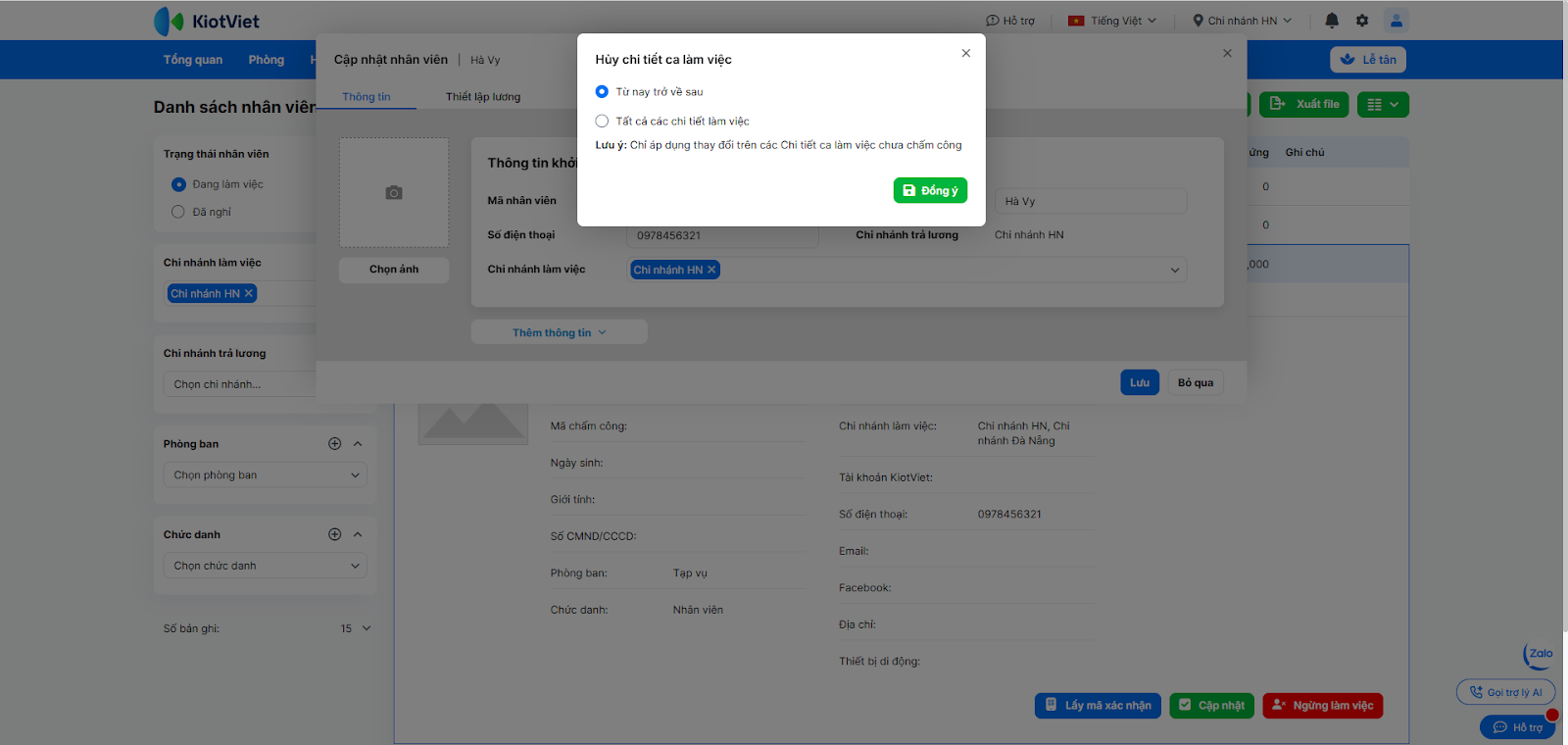 - Lưu ý: Khi bỏ chọn chi nhánh làm việc của nhân viên, hệ thống sẽ hỏi xác nhận về việc Hủy chi tiết ca làm việc chưa chấm công tại chi nhánh đó. Bạn chọn 1 trong 2 phương án: