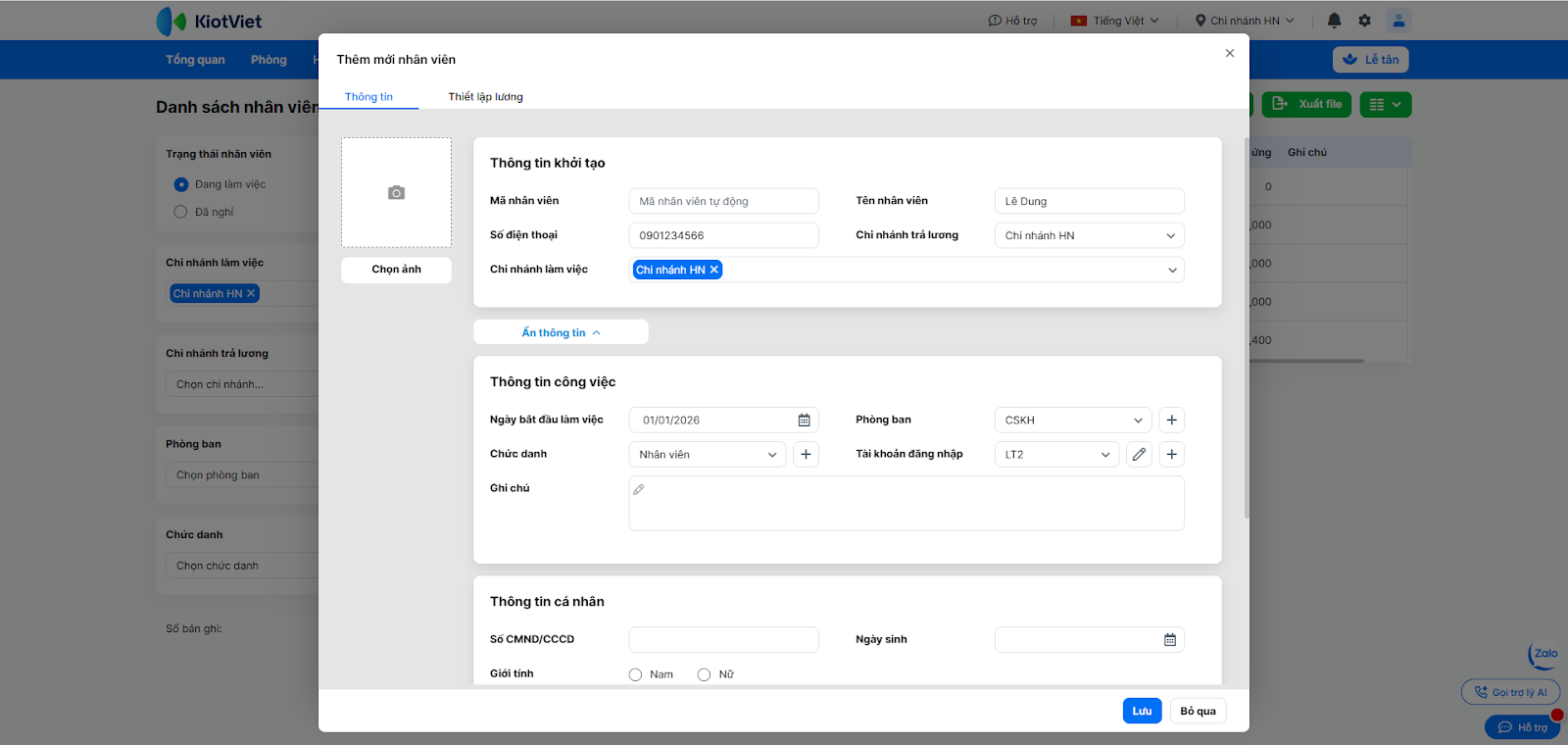 - Điền thông tin bắt buộc: Tên nhân viên, Số điện thoại, Chi nhánh trả lương, Chi nhánh làm việc.