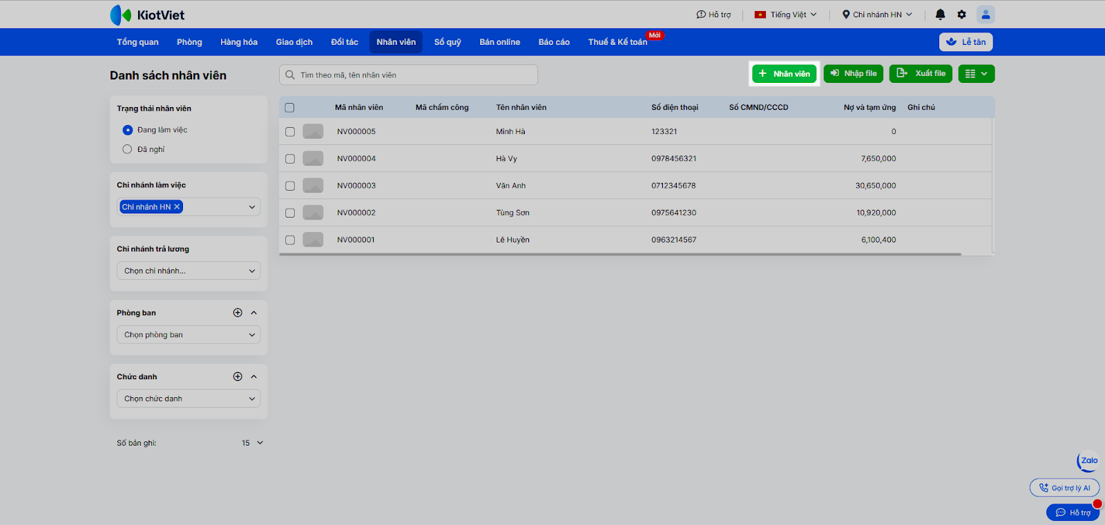 - Tại màn hình Nhân viên, nhấn vào nút + Nhân viên.