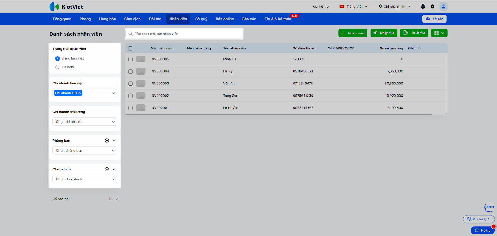 - Quản lý thông tin tập trung: Lưu trữ đầy đủ hồ sơ cá nhân, chi nhánh làm việc và thông tin liên hệ của nhân viên tại một nơi duy nhất.