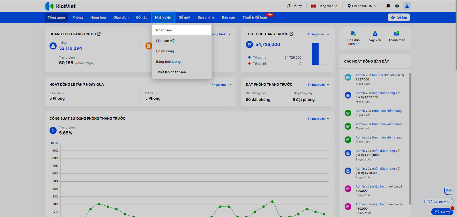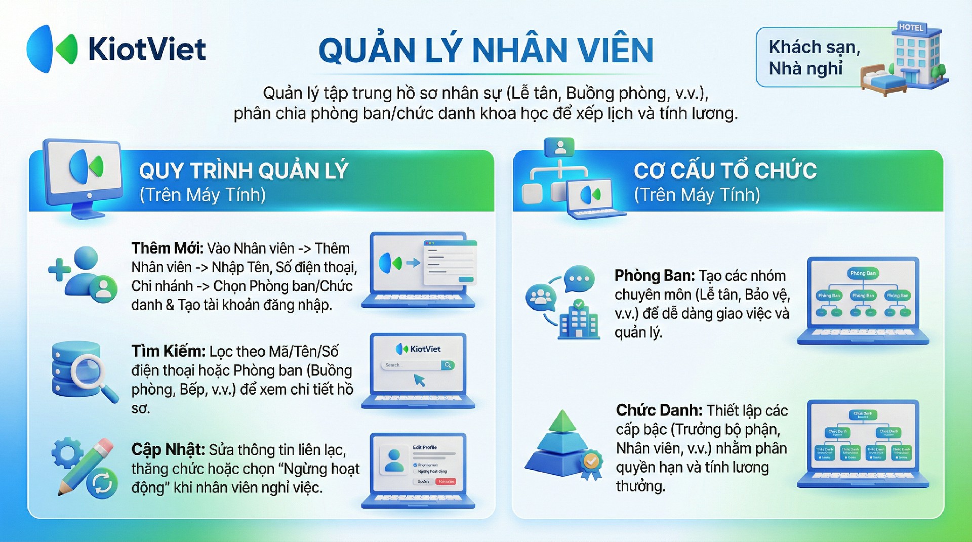 Tính năng Quản lý Nhân viên trên KiotViet Hotel giúp chủ khách sạn quản lý danh sách nhân sự một cá khoa học và chính xác. Việc ghi nhận đầy đủ thông tin nhân viên, bao gồm phòng ban (Lễ tân, Buồng phòng, Bếp…) và chức danh, là nền tảng quan trọng cho các nghiệp vụ quản lý nhân sự khác như xếp lịch làm việc, chấm công và tính lương.