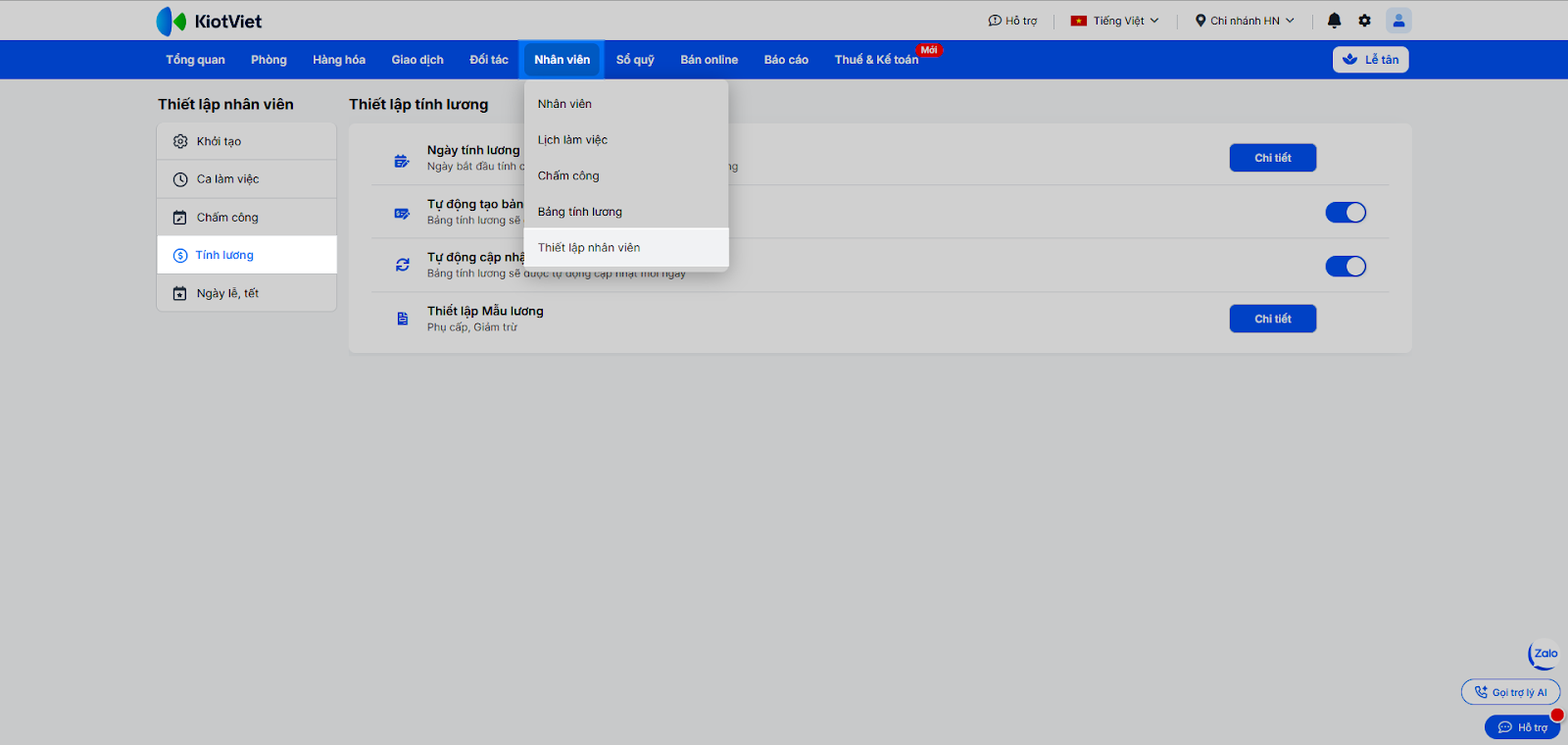 - Trên màn hình Quản lý, vào menu Nhân viên → Thiết lập nhân viên → Tính lương.