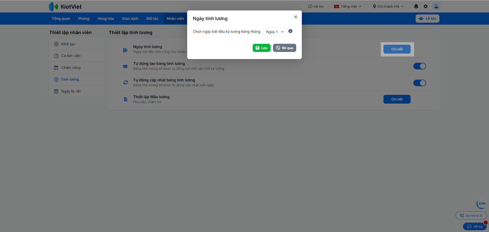 - Ngày tính lương: Nhấn Chi tiết, chọn ngày bắt đầu kỳ lương hàng tháng (ví dụ: Ngày 1) và nhấn Lưu.