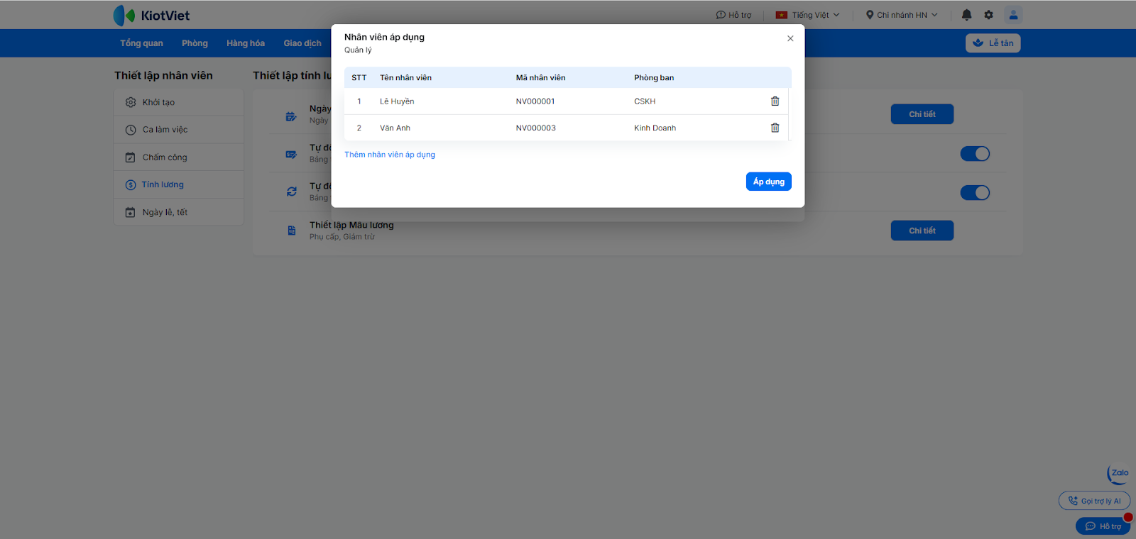 - Nhấn vào nút Nhân viên trên từng dòng mẫu lương → chọn Thêm nhân viên áp dụng để áp dụng mẫu lương cho nhân viên cụ thể → chọn Áp dụng để lưu thông tin.