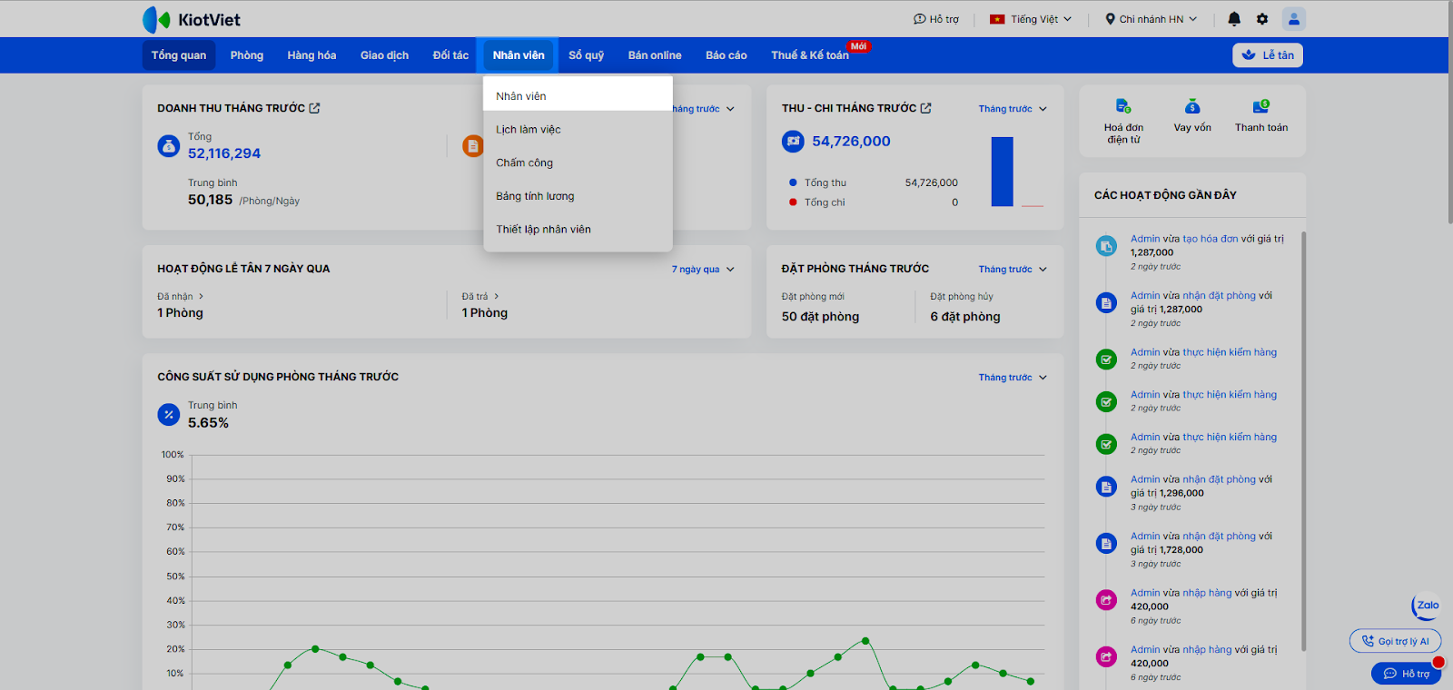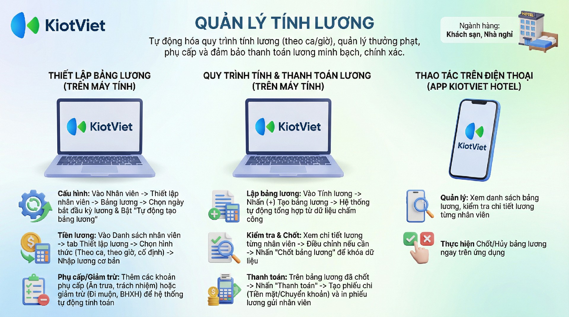 Tính năng Quản lý tính lương trên KiotViet Hotel giúp chủ khách sạn tự động hóa và quản lý quy trình tính lương cho nhân viên một cách chính xác và minh bạch. Từ việc thiết lập các quy tắc tính lương, quản lý ngày nghỉ lễ, đến việc tạo bảng lương, chốt lương và thanh toán, tính năng này giúp tiết kiệm thời gian, giảm thiểu sai sót và đảm bảo quyền lợi cho nhân viên.