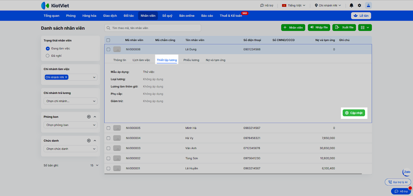 - Chọn nhân viên → chọn tab Thiết lập lương → nhấn Cập nhật.