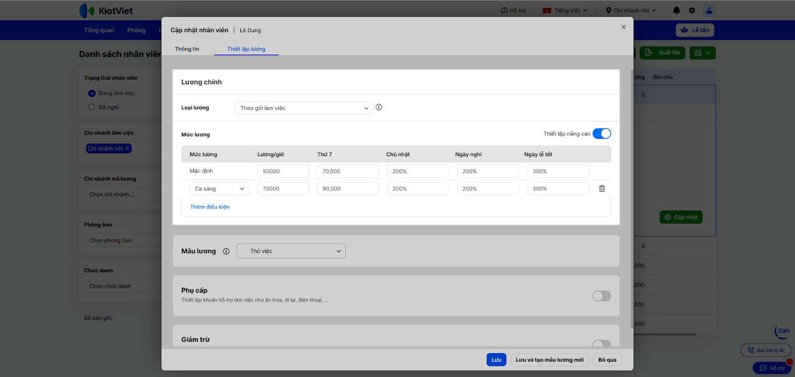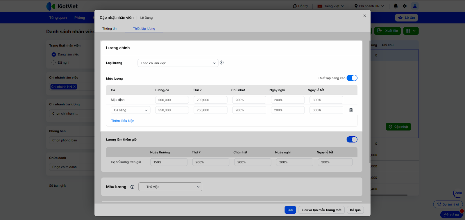 - Theo ca làm việc: Nhập mức lương cho mỗi ca. Bật xanh Thiết lập nâng cao để tùy chỉnh lương khác nhau cho từng ca (Sáng/Chiều/Đêm) hoặc thiết lập lương riêng cho Thứ 7, Chủ nhật, Ngày nghỉ, Ngày lễ tết.