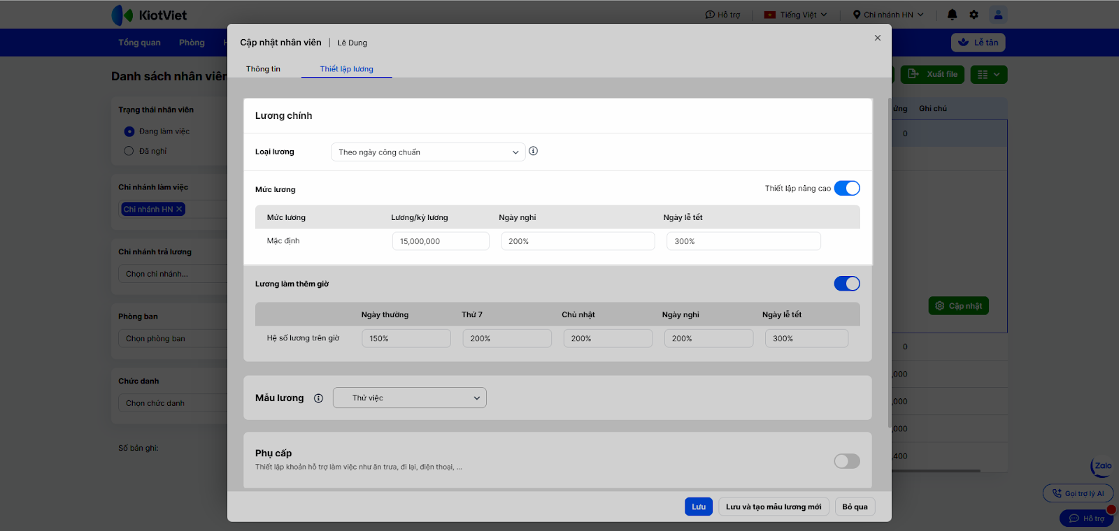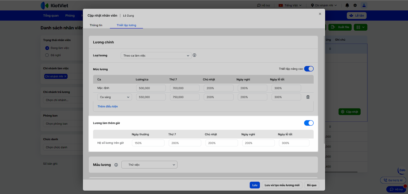 - Lương làm thêm giờ: (Áp dụng nếu lương chính tính theo Ca hoặc Ngày công chuẩn) Bật xanh và thiết lập hệ số lương làm thêm giờ (ví dụ: 150%, 200%).