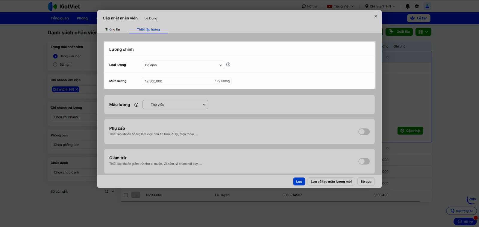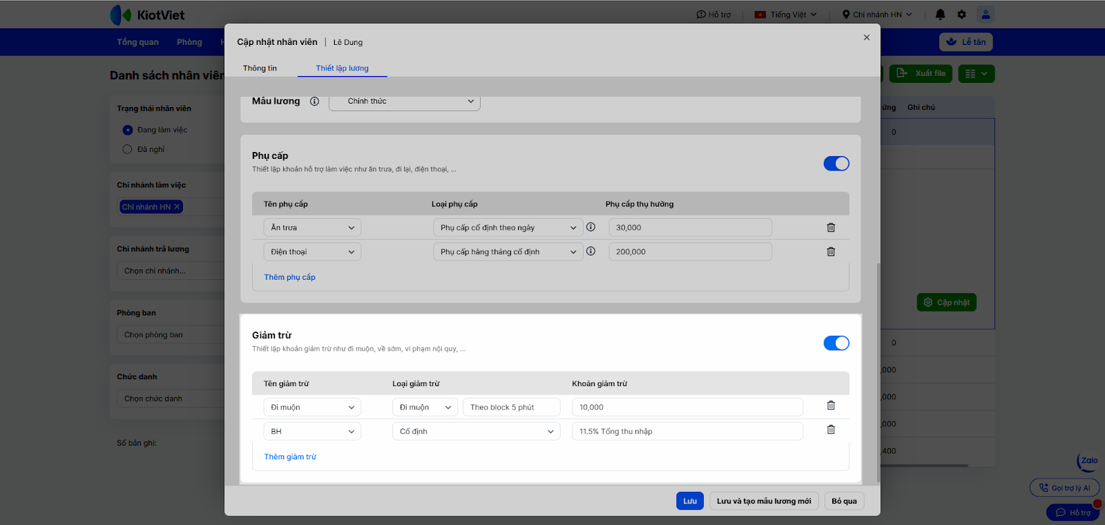 - Tình huống: Khi bạn cần cài đặt mức lương chi tiết (theo ca, cố định) và các khoản phụ cấp ăn trưa, giảm trừ đi muộn cho một nhân viên lễ tân cụ thể.