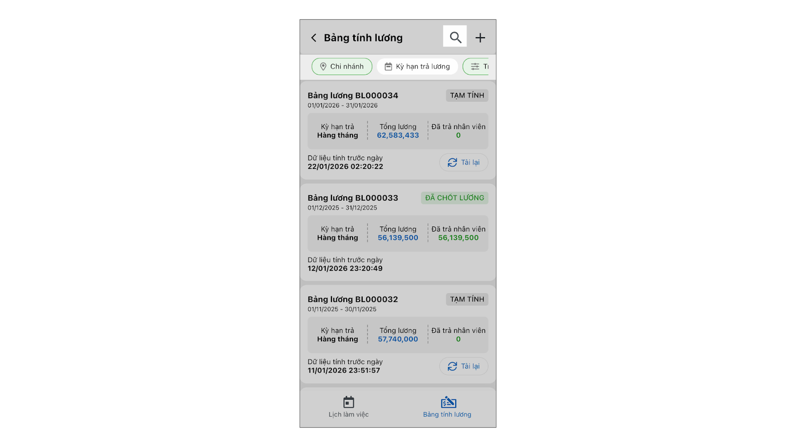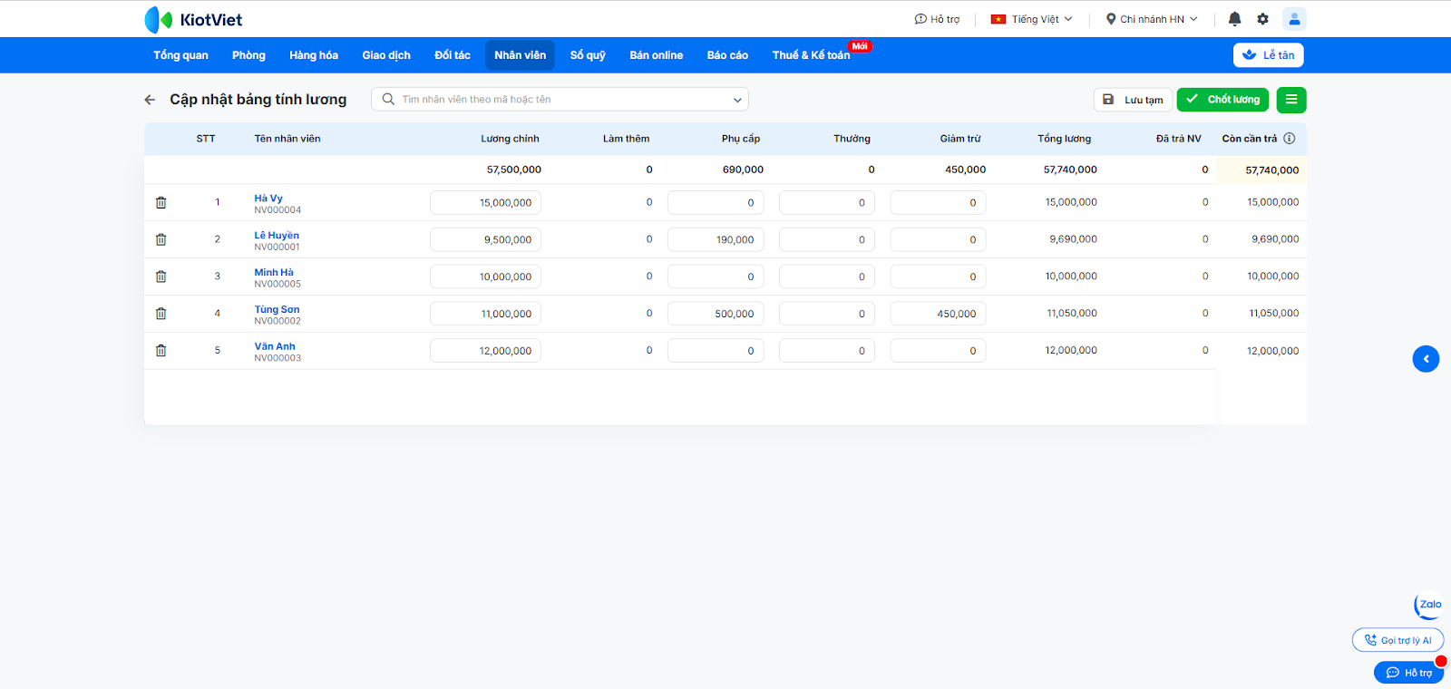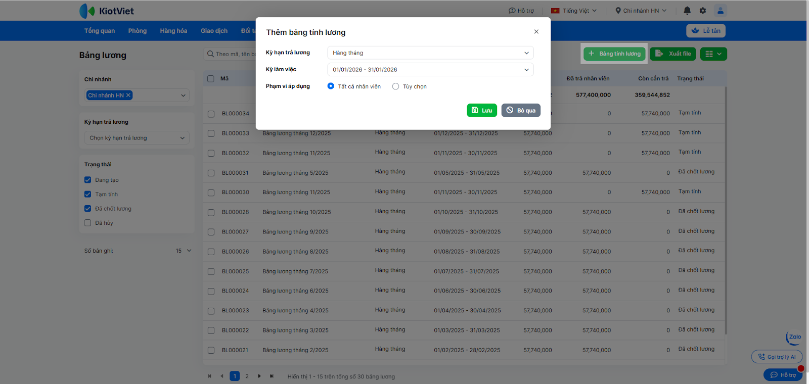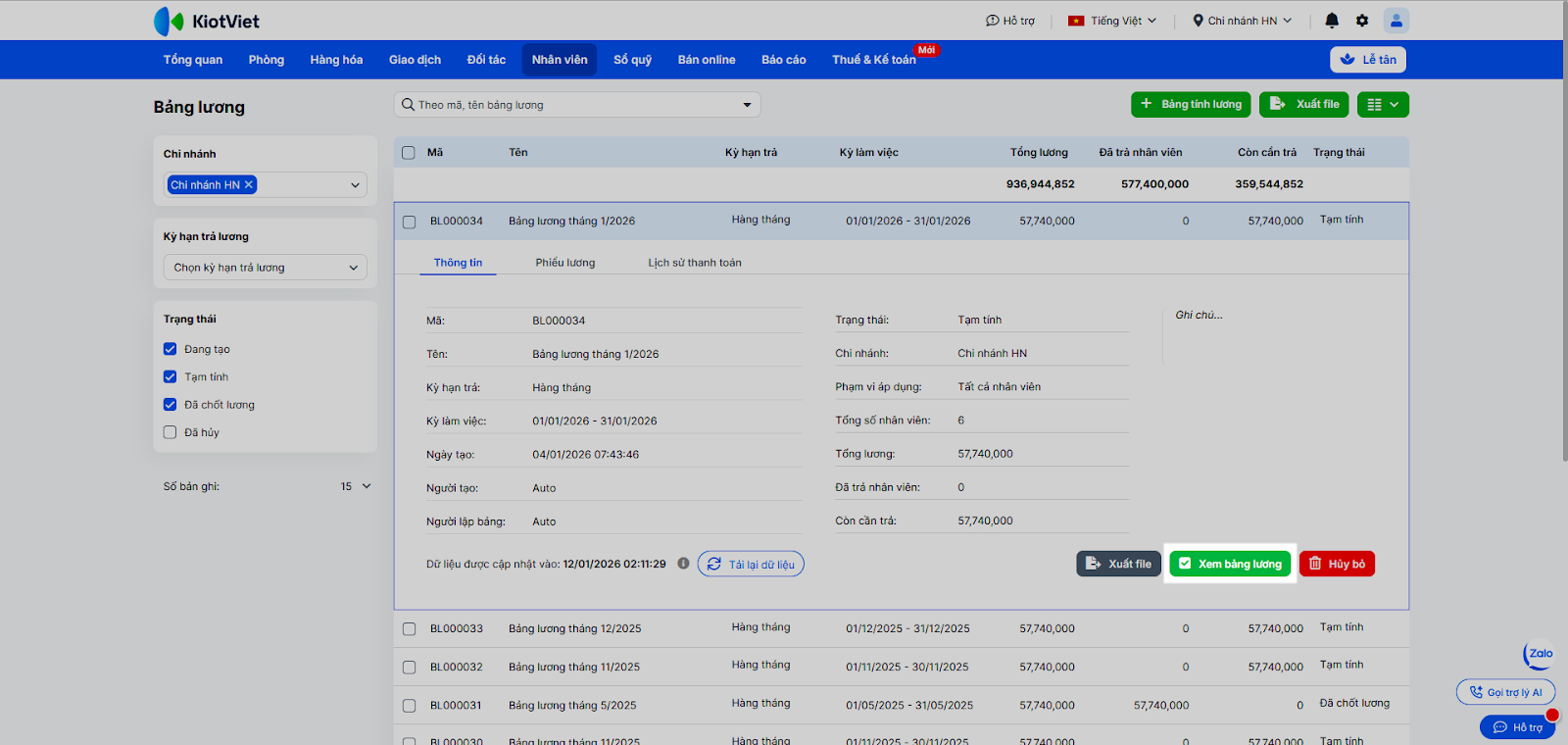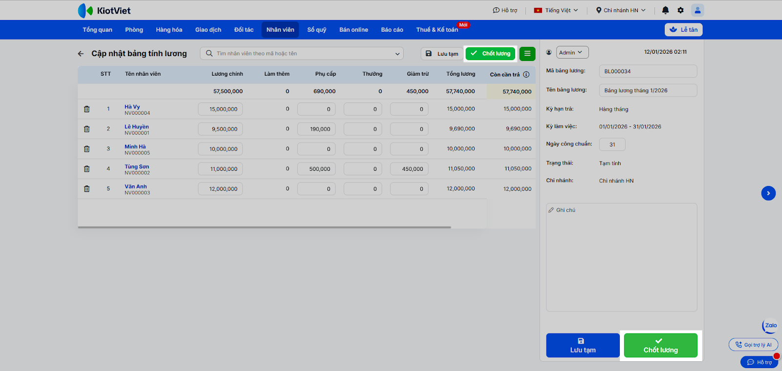 - Nhấn Lưu. Hệ thống sẽ tạo bảng lương tạm tính.