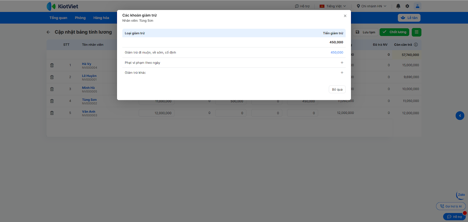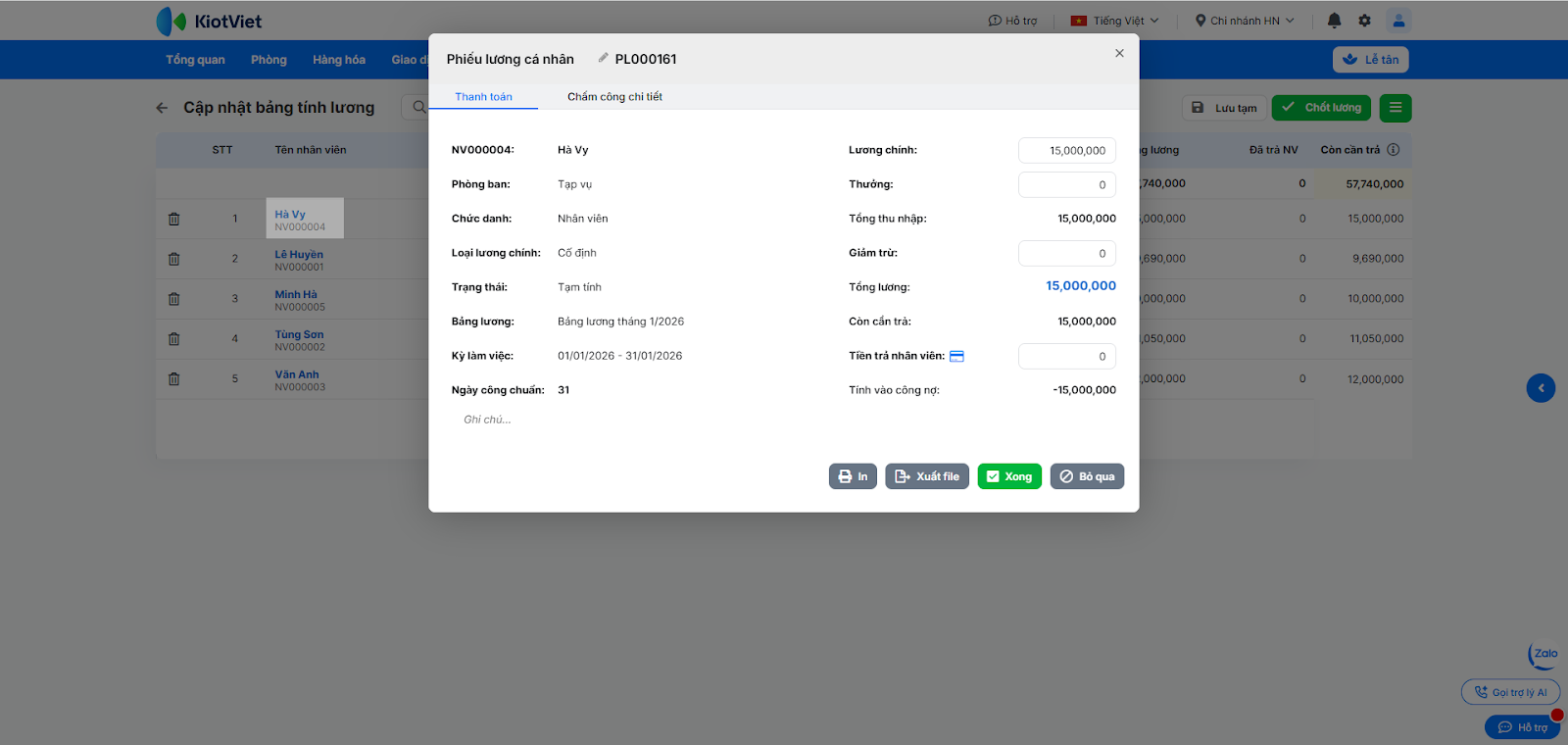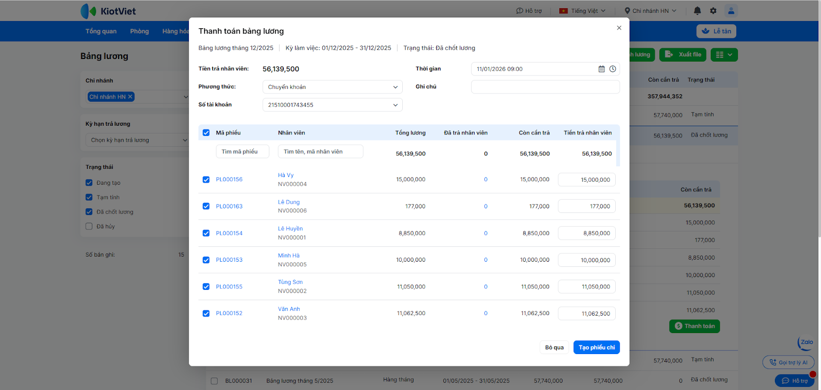 - Pop-up Thanh toán bảng lương hiển thị danh sách nhân viên và số tiền cần trả. Bạn có thể: