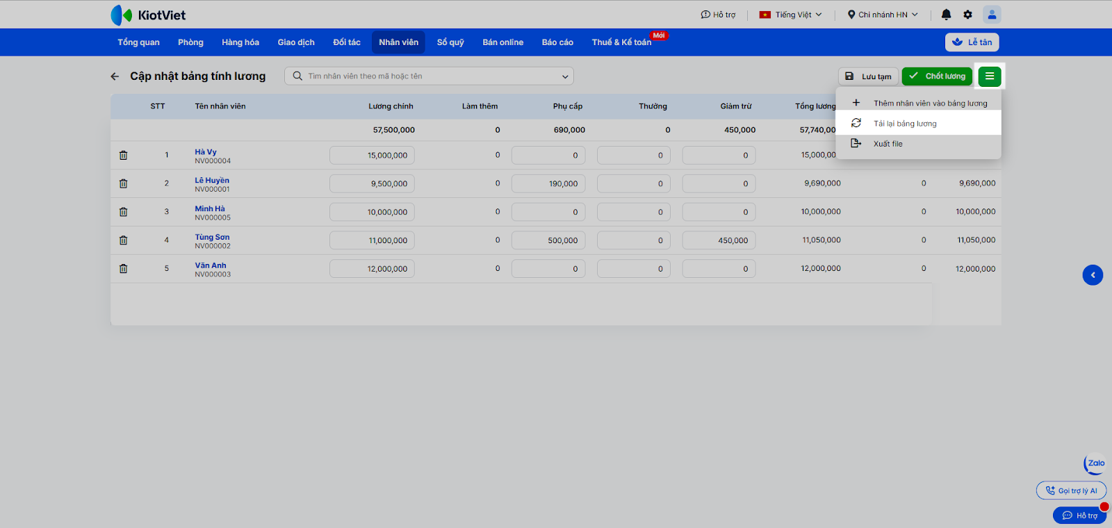 - Tải lại dữ liệu: Nếu có thay đổi về chấm công hoặc thiết lập lương sau khi tạo bảng, nhấn biểu tượng tùy chọn 3 gạch → chọn Tải lại bảng lương để cập nhật.