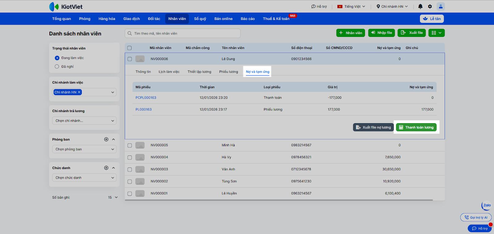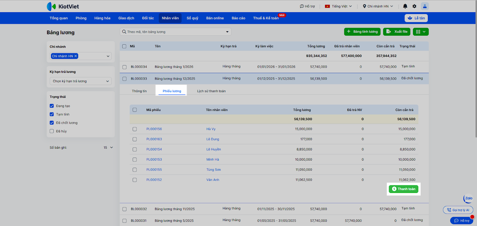Sau khi chốt lương, bạn thực hiện thanh toán cho nhân viên.