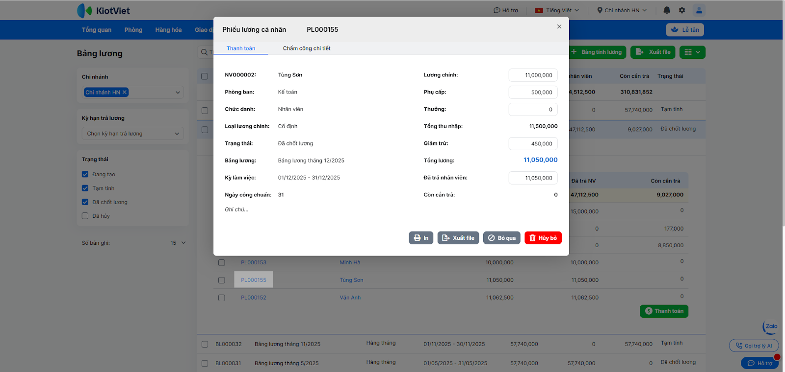 - Xóa: Khi xem chi tiết bảng lương → nhấn biểu tượng thùng rác → xác nhận Đồng ý.