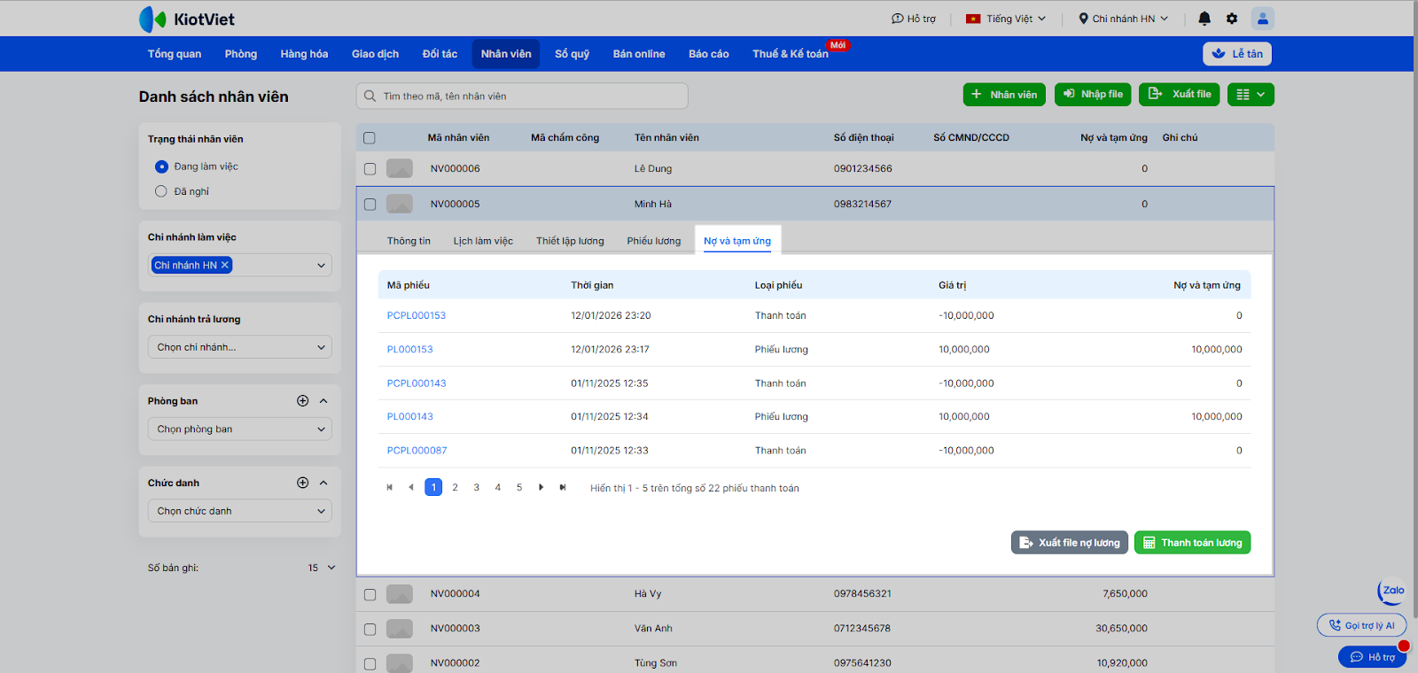 - Chọn nhân viên → chuyển sang tab Nợ và tạm ứng. Tab này hiển thị danh sách tất cả các Phiếu lương đã chốt và các lần Thanh toán/Tạm ứng lương.