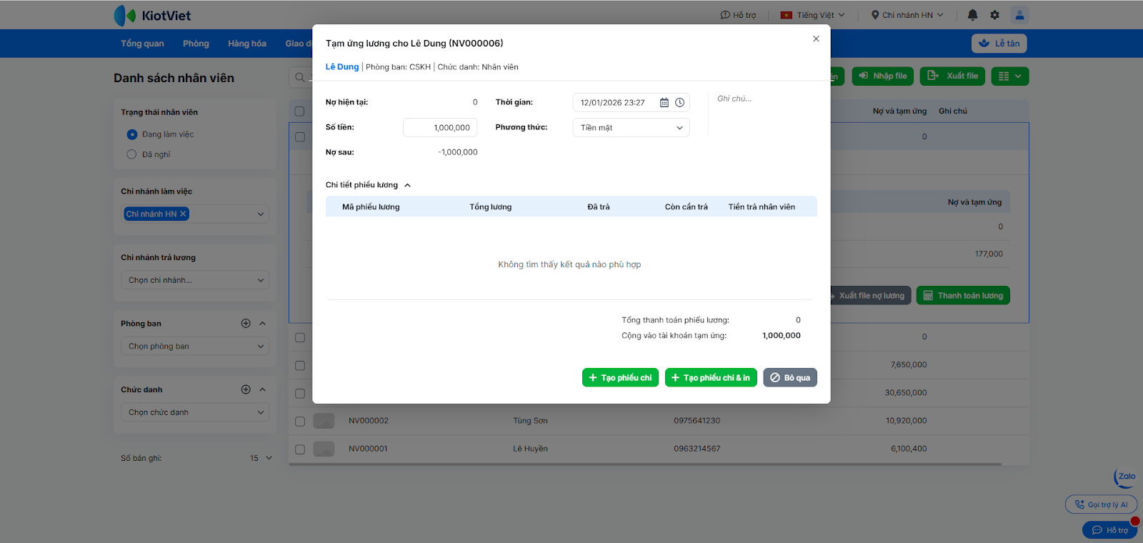 - Lưu ý: Nếu nhân viên không còn nợ lương (Nợ cần trả = 0), phiếu chi này sẽ được ghi nhận là tạm ứng lương và tự động trừ vào kỳ lương tiếp theo khi chốt.
