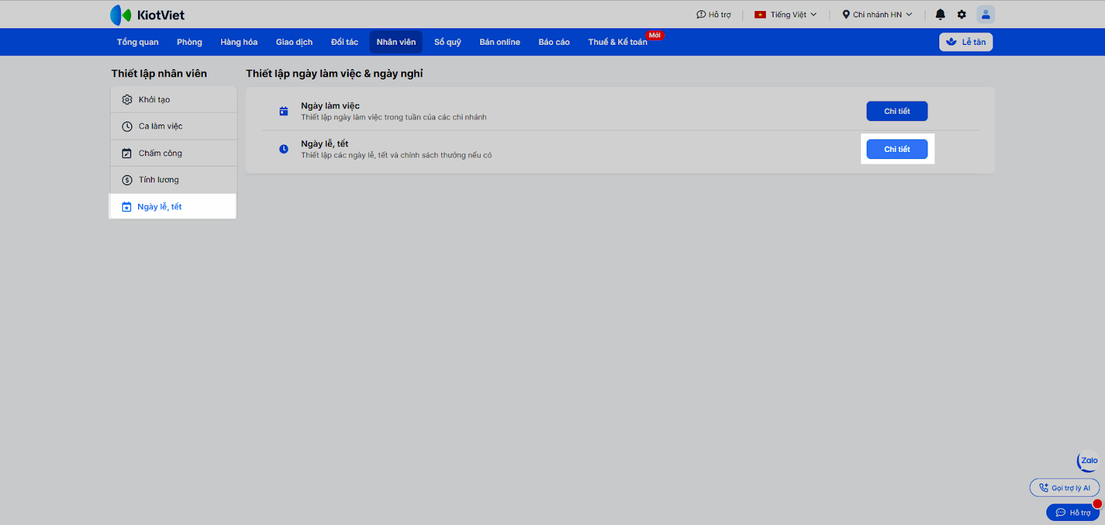 - Chọn Ngày lễ, tết → nhấn Chi tiết trên dòng Ngày lễ, tết.