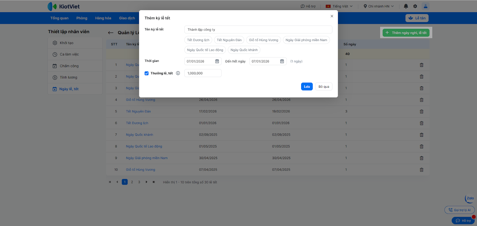 - Tình huống: Thiết lập các ngày nghỉ lễ, tết để áp dụng hệ số lương làm thêm giờ hoặc thưởng lễ.