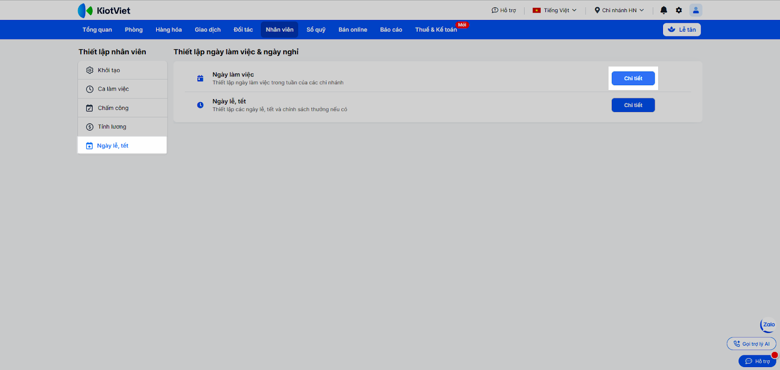 - Chọn Ngày lễ, tết → nhấn Chi tiết trên dòng Ngày làm việc.
