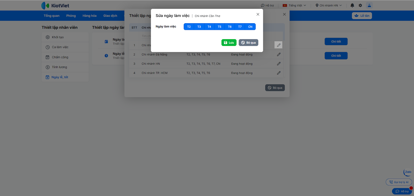 - Thiết lập linh hoạt: Cho phép cài đặt ngày tính lương, giờ công chuẩn, quy tắc tính nửa công, tự động tạo bảng lương và quản lý các ngày lễ tết, ngày làm việc của chi nhánh.