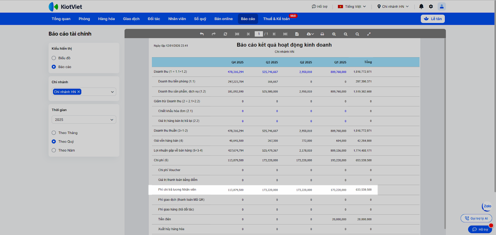 - Tìm đến mục Chi phí → Chi phí trả lương Nhân viên để xem tổng chi phí lương đã chốt trong kỳ báo cáo.
