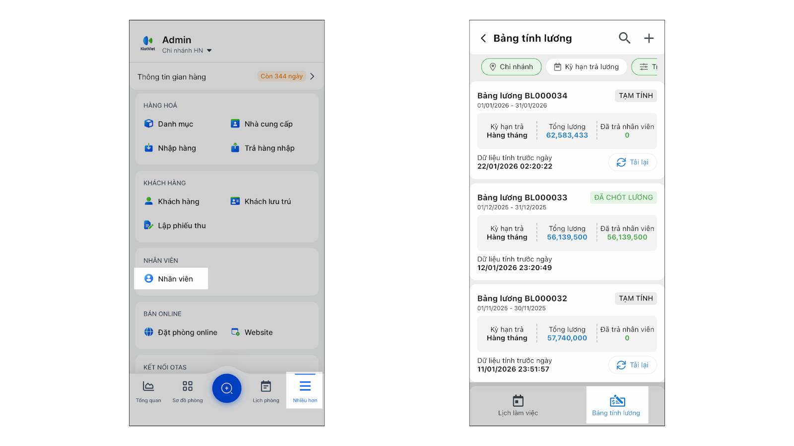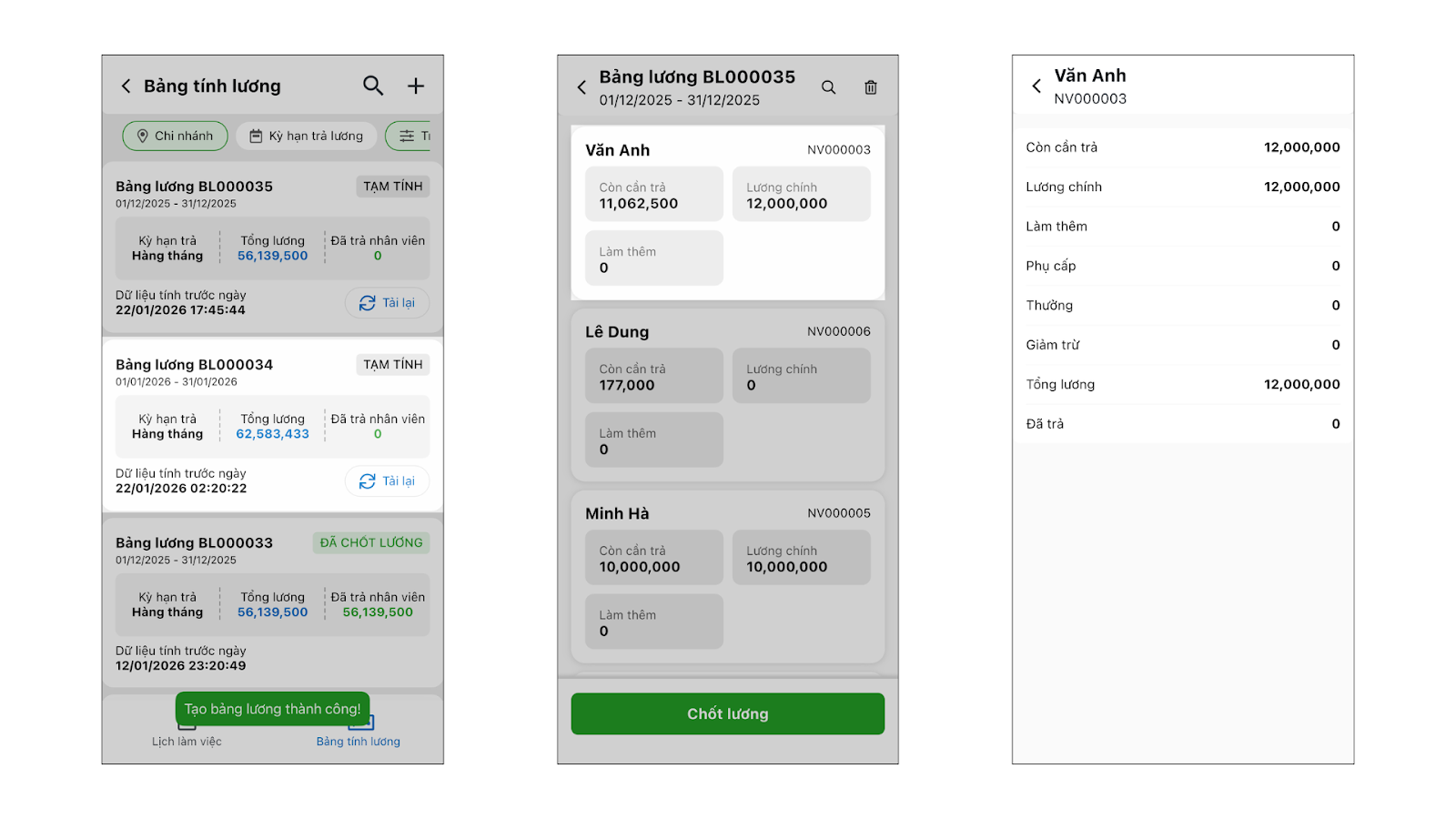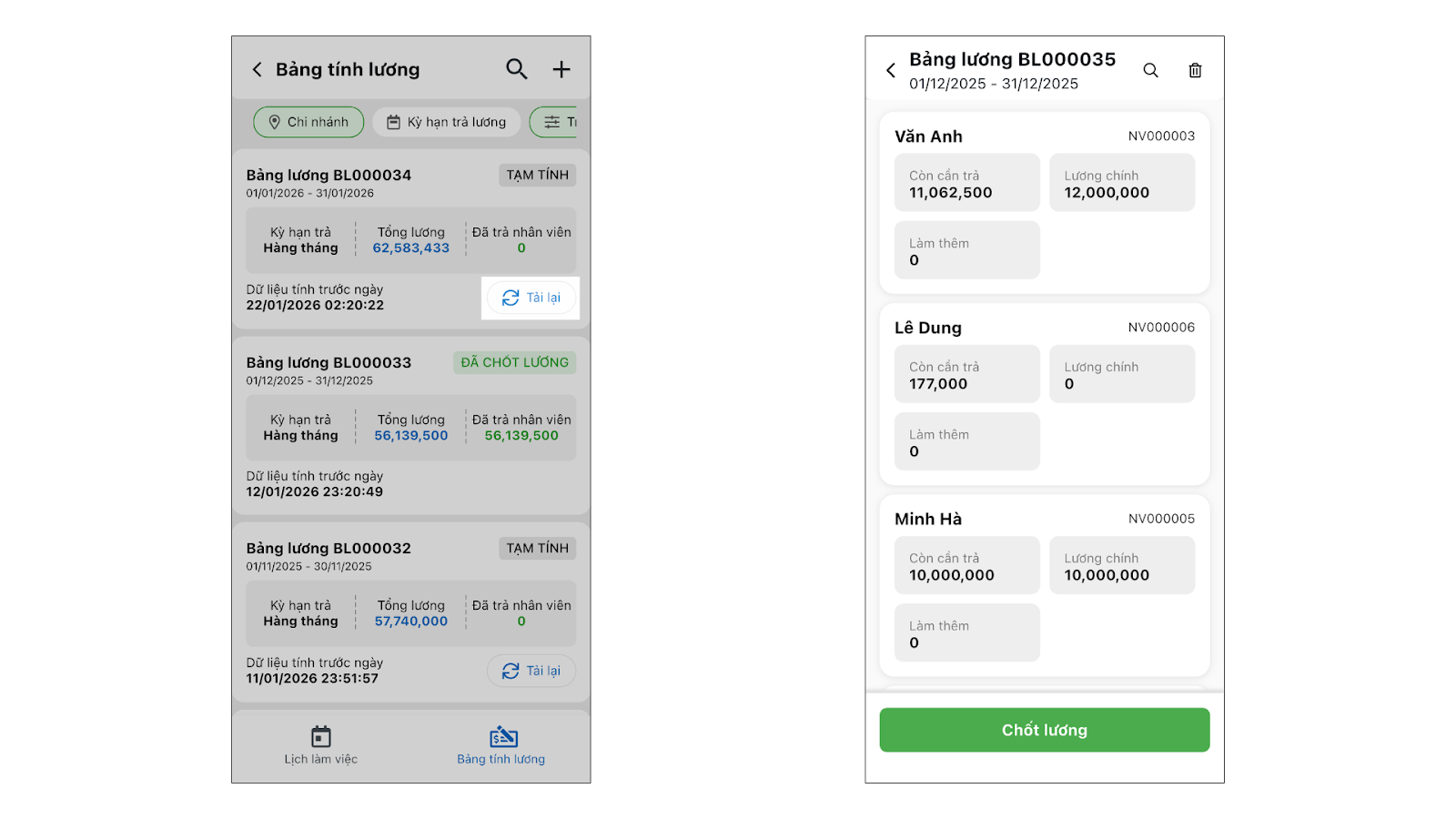 - Tình huống: Quản lý muốn tính lương, kiểm tra chi tiết phiếu lương, hoa hồng hoặc xóa bảng lương tạm tính ngay trên điện thoại.