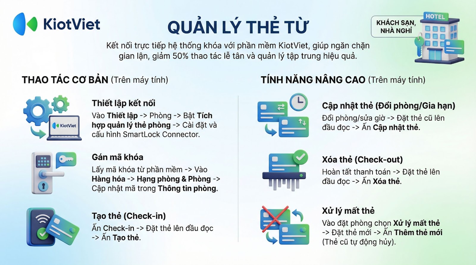 Hiểu được nhu cầu cần quản lý, giám sát, KiotViet Hotel ra mắt tính năng tích hợp quản lý thẻ từ dành cho khách hàng KiotViet sử dụng gói chuyên nghiệp, cao cấp, giúp đem lại rất nhiều lợi ích cho việc kinh doanh: