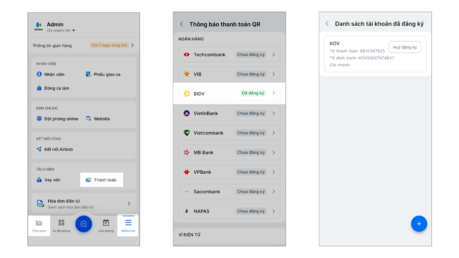 Tại ứng dụng KiotViet Hotel trên điện thoại, bạn có thể thực hiện các thao tác tương tự giao diện trên website bao gồm đăng ký, nhận thông báo kết quả giao dịch và quản lý các tài khoản đã liên kết.