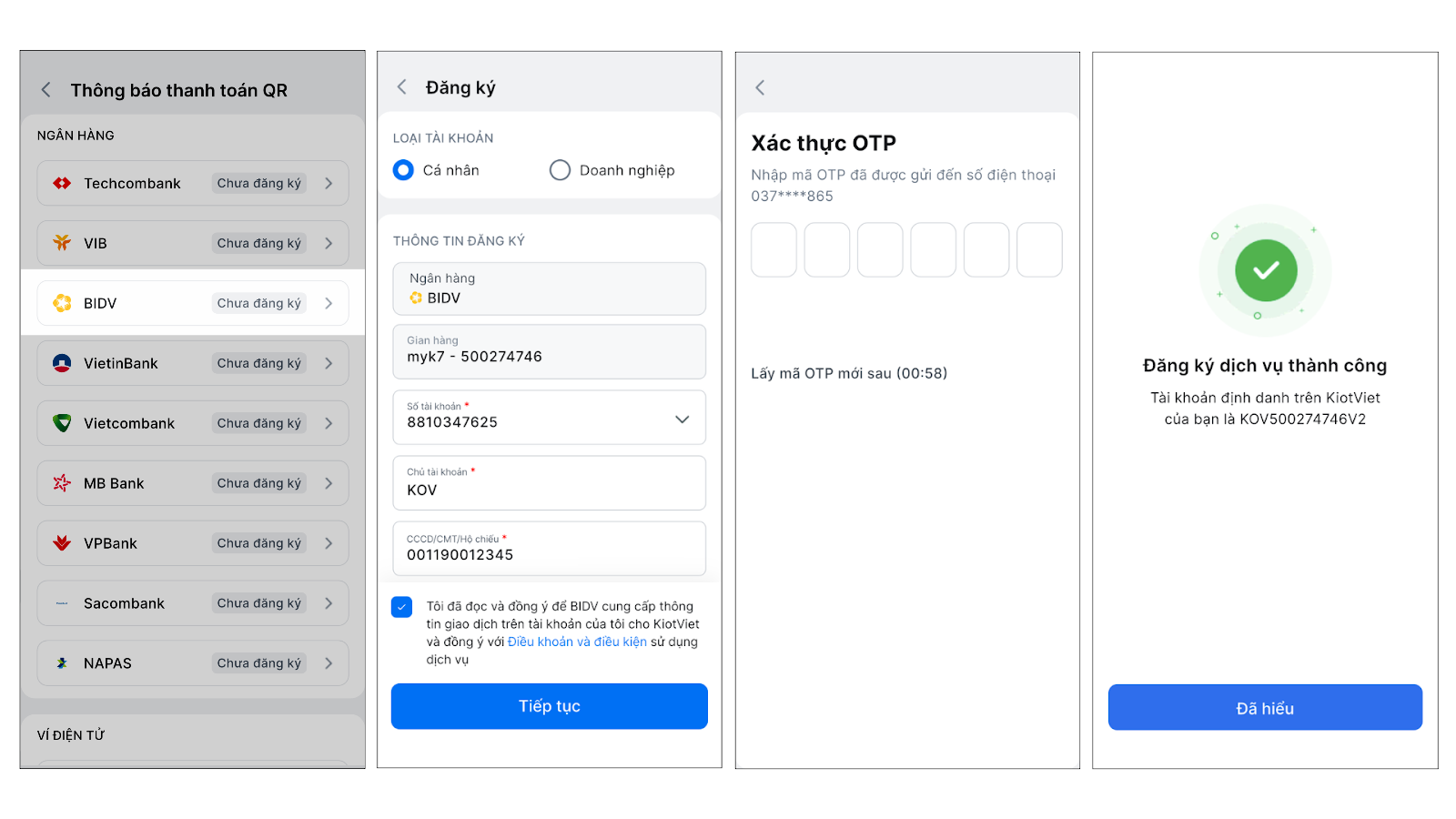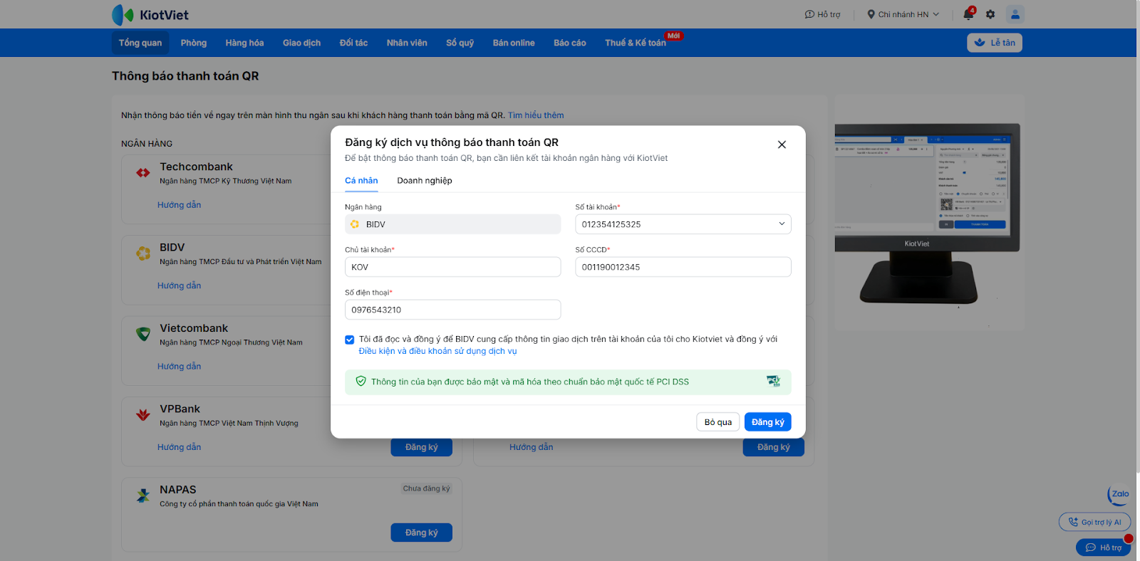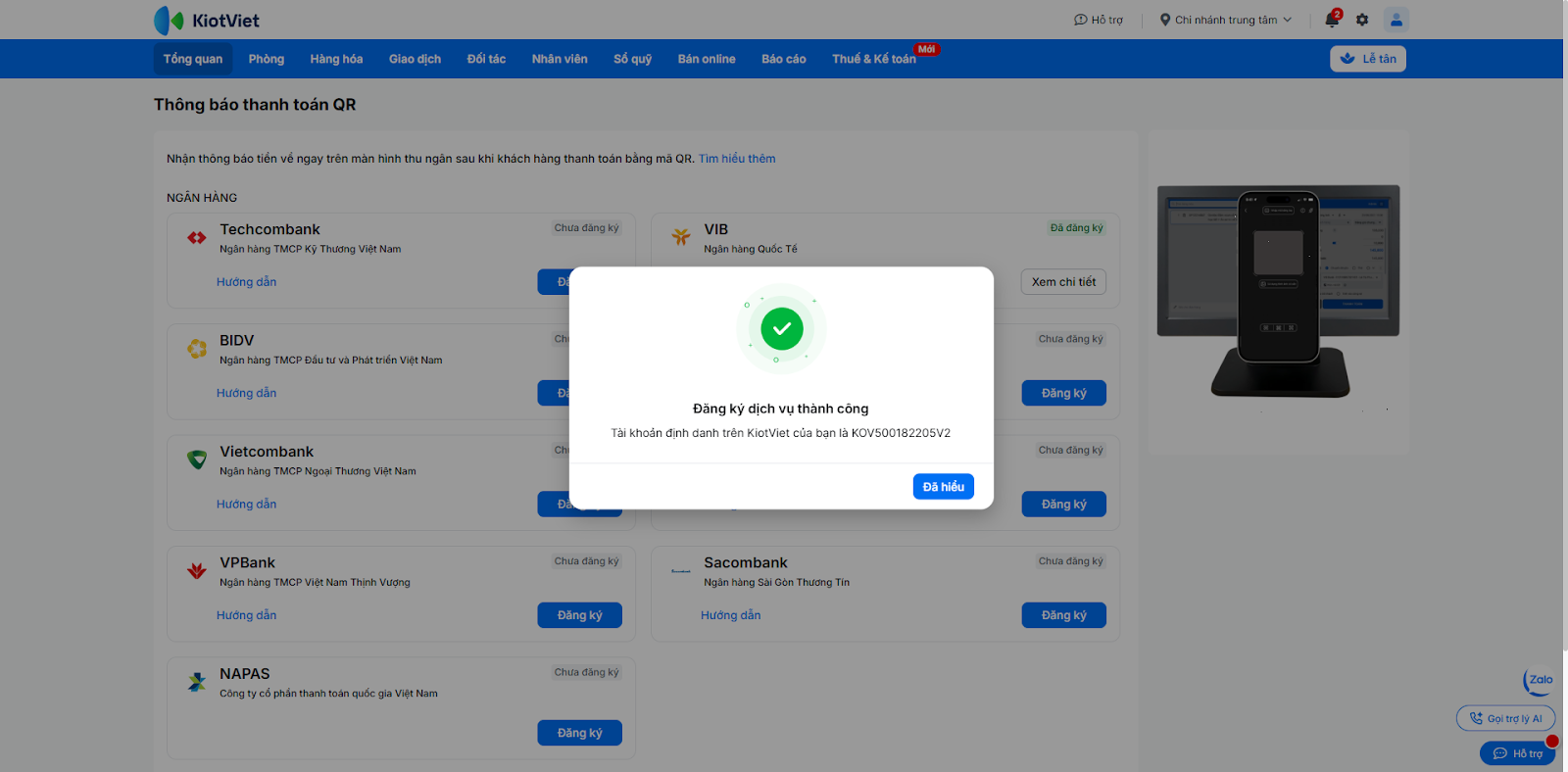 Để kích hoạt tính năng nhận thông báo thanh toán tự động, bạn cần đăng ký dịch vụ trực tiếp trên phần mềm KiotViet và xác thực bằng mã OTP.
