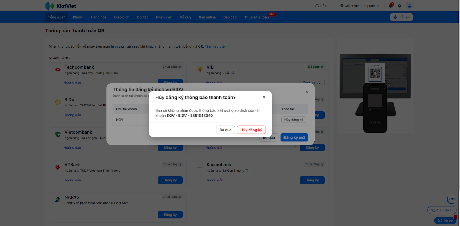 - Tình huống: Khi bạn cần kiểm tra lại thông tin các tài khoản BIDV nào đang được kết nối để nhận thông báo tự động trên KiotViet.