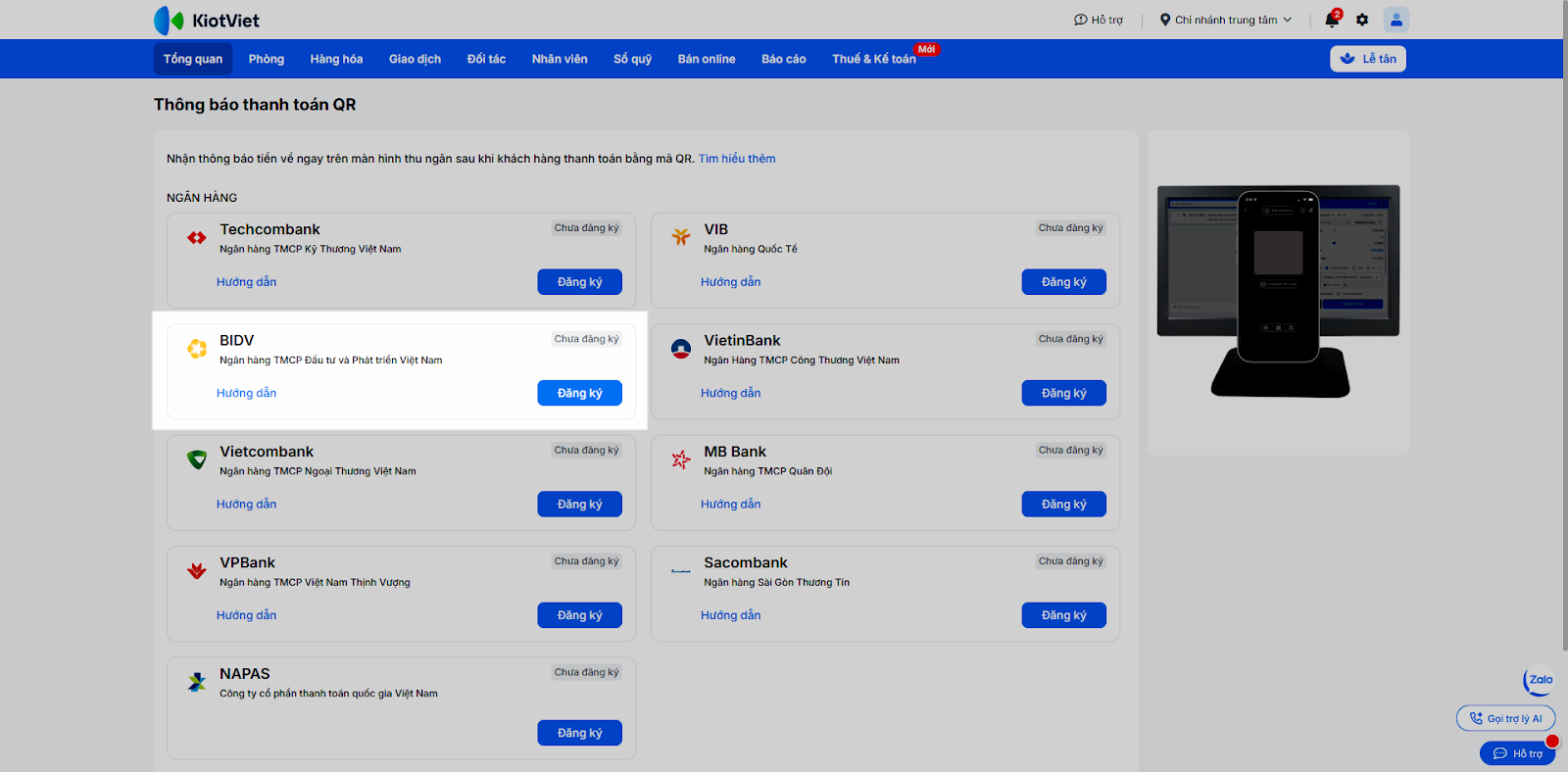 - Một gian hàng KiotViet có thể liên kết với nhiều tài khoản BIDV.