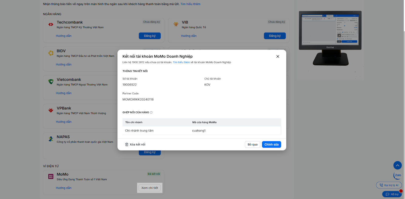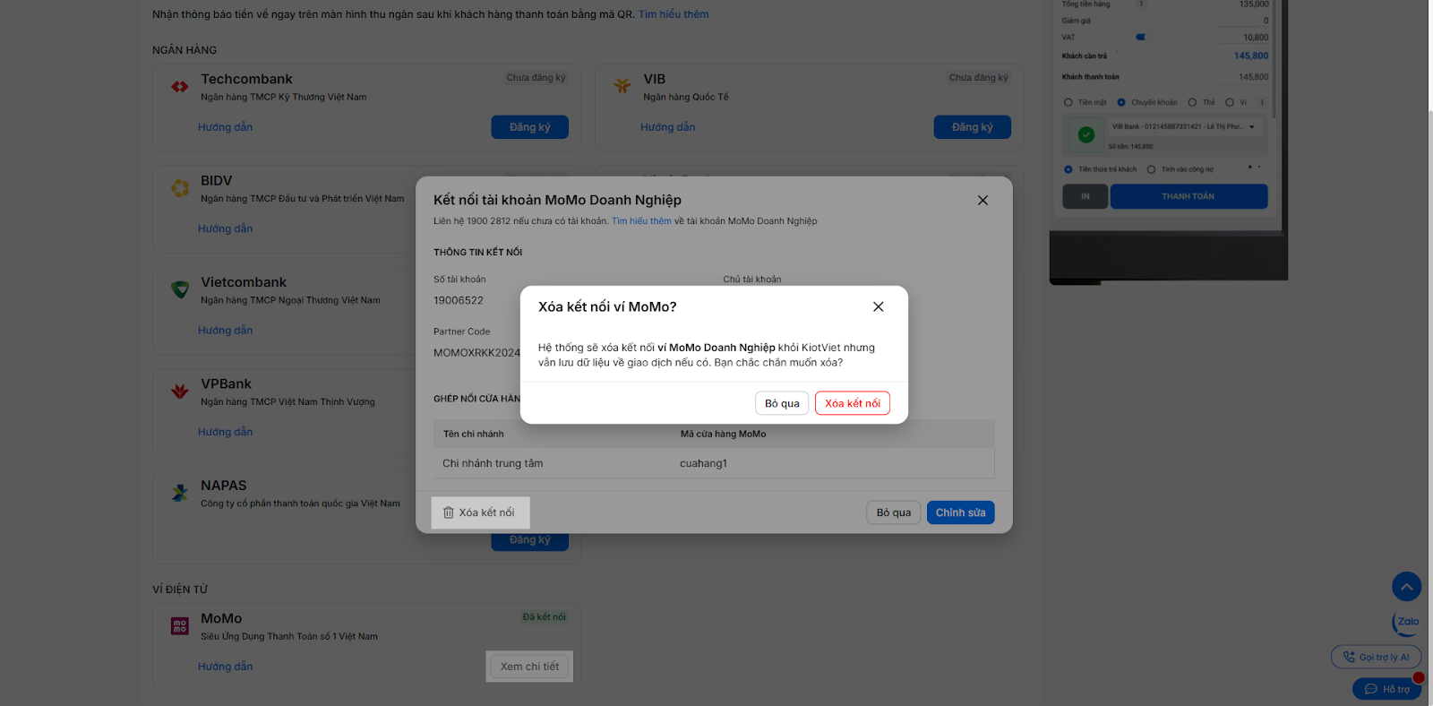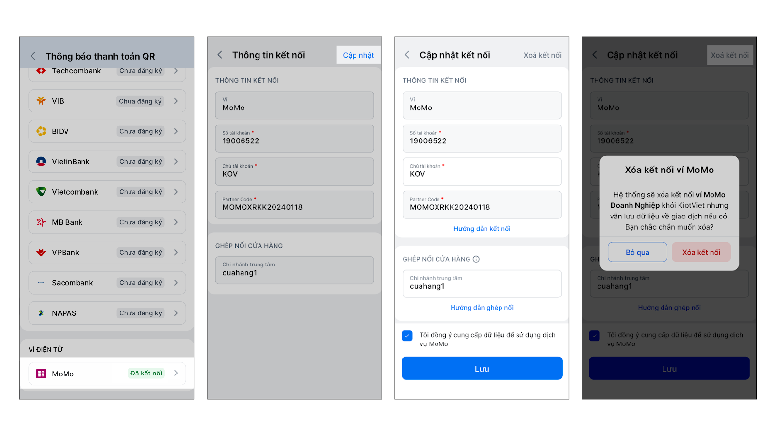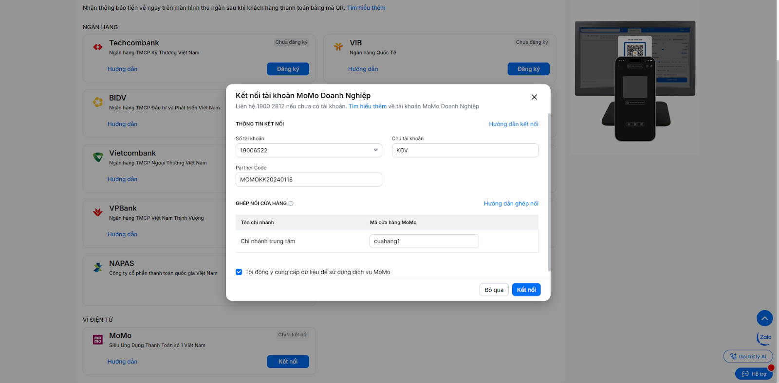 - Để thay đổi Số tài khoản và Partner code, bạn cần xóa kết nối hiện tại và thực hiện kết nối lại từ đầu.