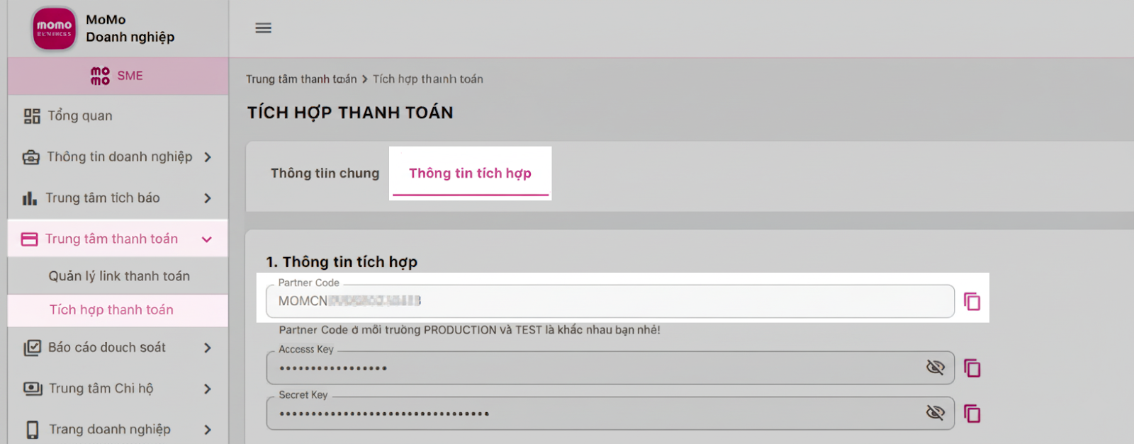 - Partner code: Bạn lấy thông tin trong Trung tâm thanh toán → Tích hợp thanh toán → Thông tin tích hợp.