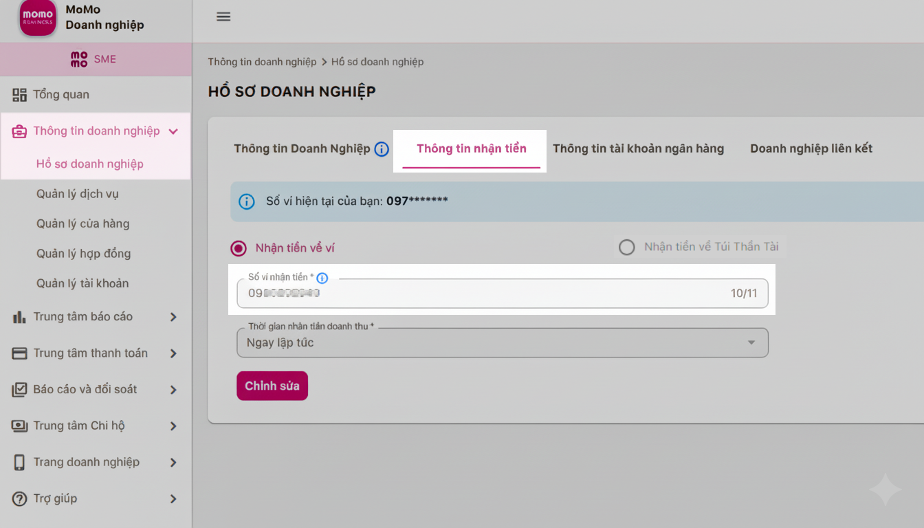 - Tình huống: Khi bạn muốn sửa, xóa hoặc kết nối với một tài khoản MoMo Doanh nghiệp khác.