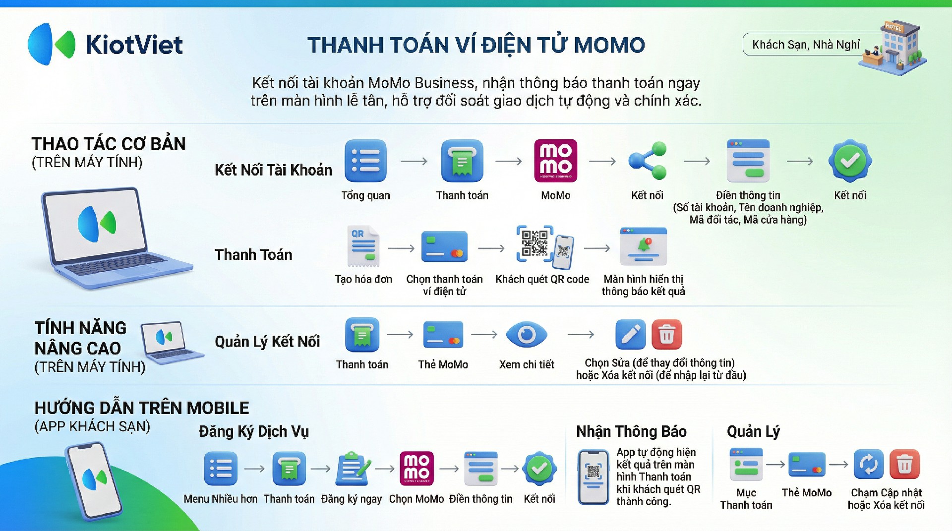 - Giúp chủ khách sạn và quản lý: Dễ dàng kết nối và quản lý tài khoản MoMo Doanh nghiệp, tập trung dòng tiền và đối soát giao dịch tự động, giảm thiểu sai sót thủ công.