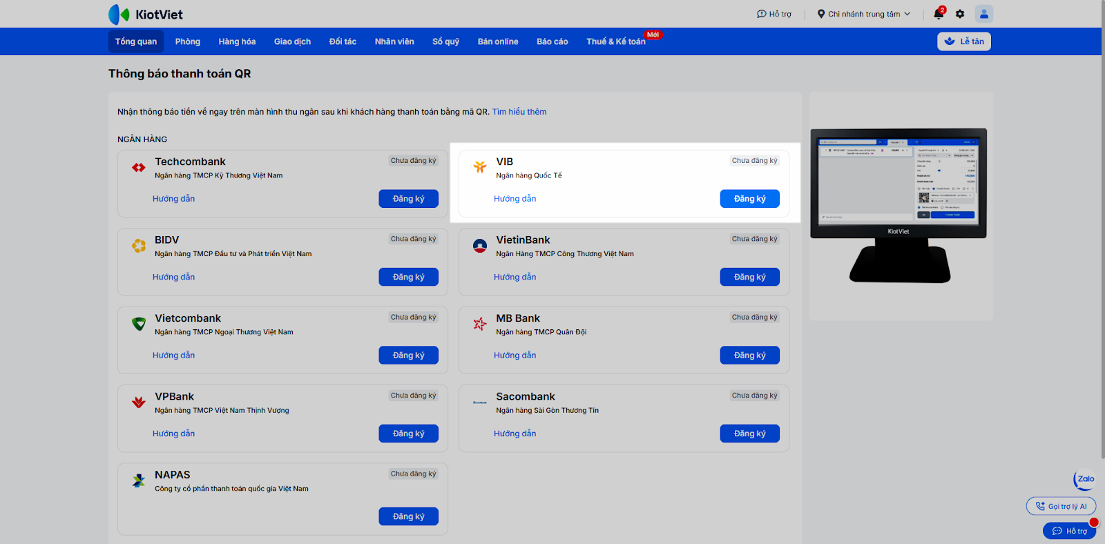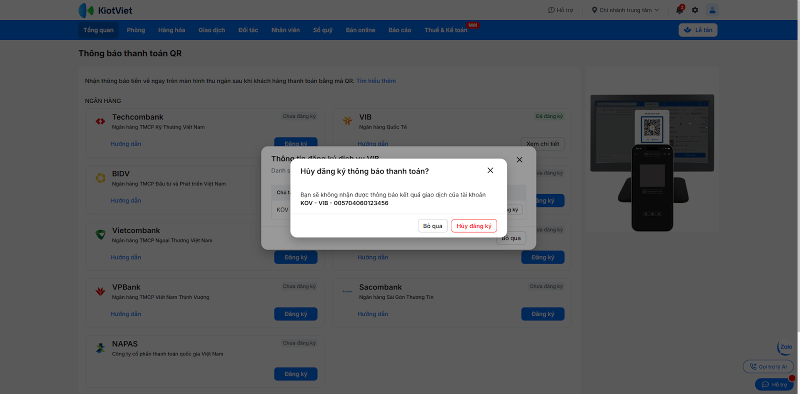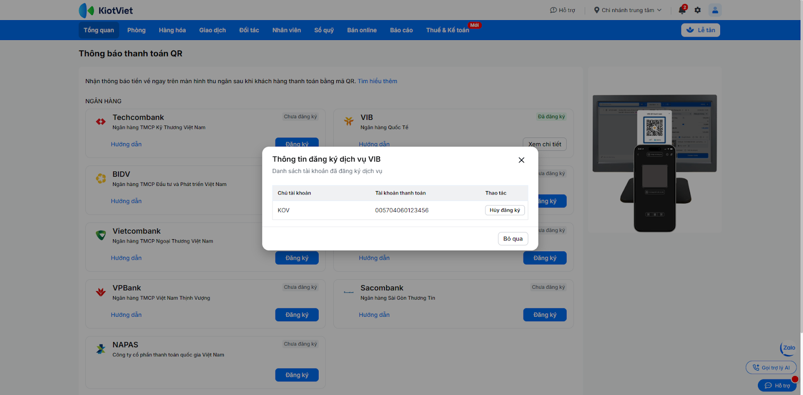- Mỗi gian hàng KiotViet tại một thời điểm chỉ có thể liên kết với một tài khoản VIB duy nhất.