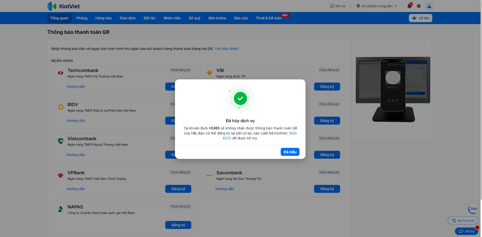 Nhằm hỗ trợ các khách sạn, nhà nghỉ thúc đẩy việc thanh toán phi tiền mặt, KiotViet kết hợp cùng ngân hàng VIB đã ra mắt tính năng thanh toán chuyển khoản bằng phương pháp quét mã VietQR và nhận thông báo kết quả ngay trên phần mềm.
