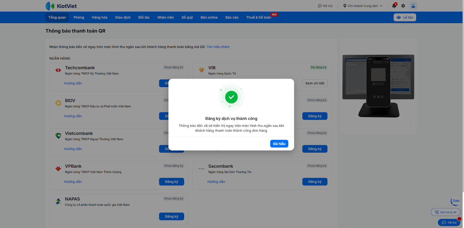 - Sau khi khách hàng quét mã và chuyển khoản thành công, màn hình Lễ tân sẽ ngay lập tức hiển thị thông báo kết quả giao dịch.