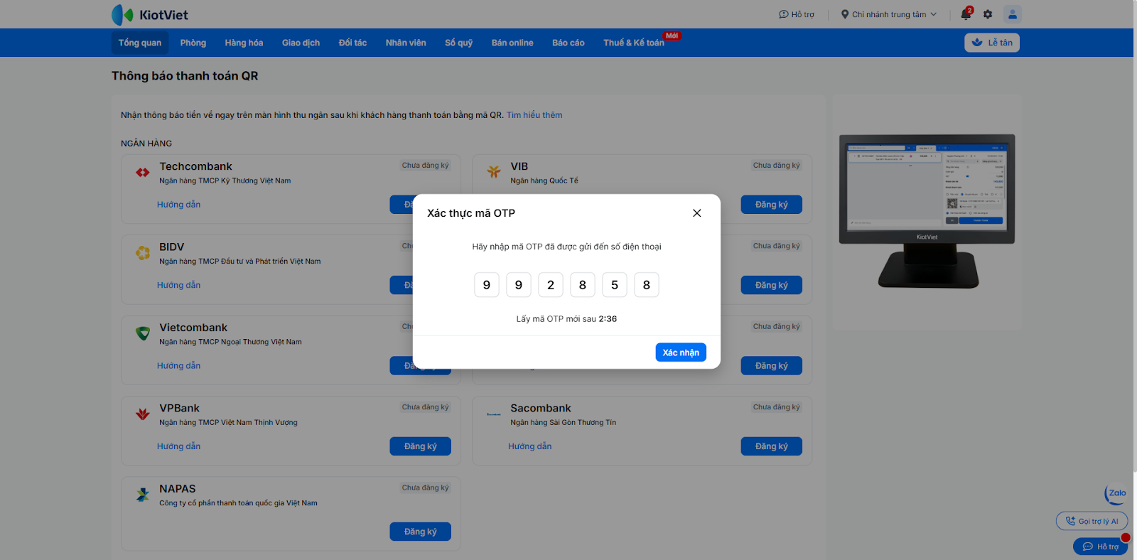 - Bạn nhập mã OTP này vào màn hình trên KiotViet để hoàn tất việc xác thực.