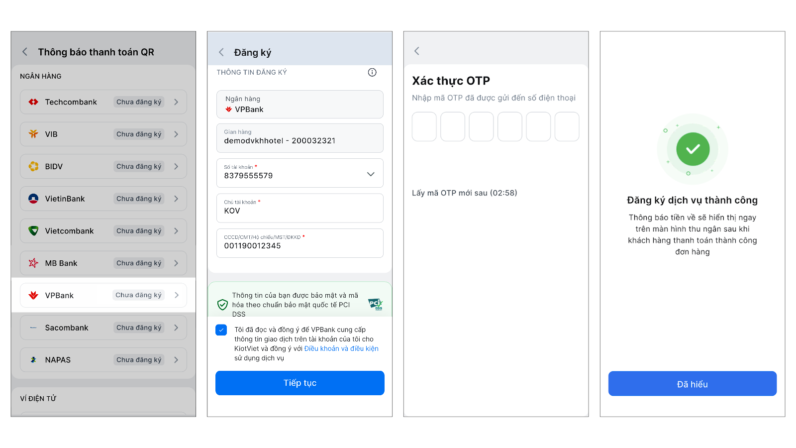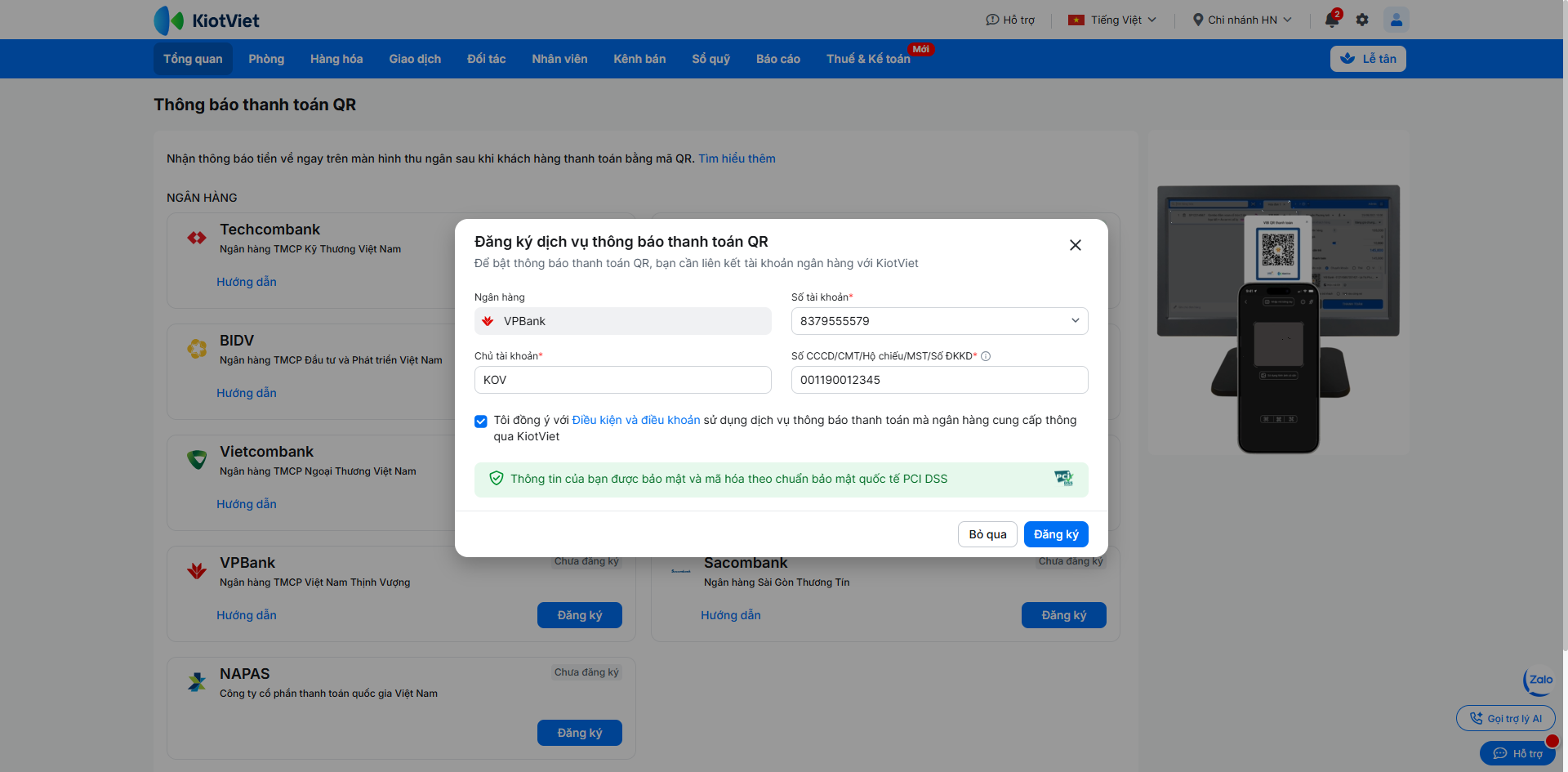 Để kích hoạt tính năng nhận thông báo thanh toán tự động, bạn cần đăng ký dịch vụ trực tiếp trên phần mềm KiotViet và xác thực bằng mã OTP.