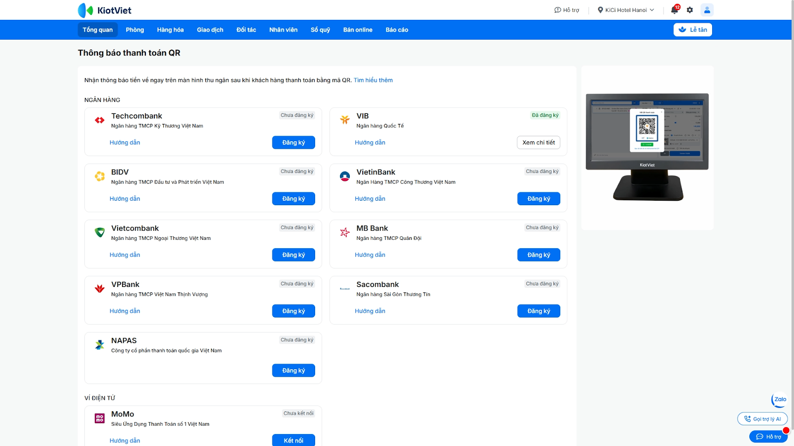 - Để sử dụng, bạn cần kích hoạt tính năng này. Vui lòng tham khảo hướng dẫn chi tiết tại website Hỗ trợ KiotViet, mục “Thanh toán”.
