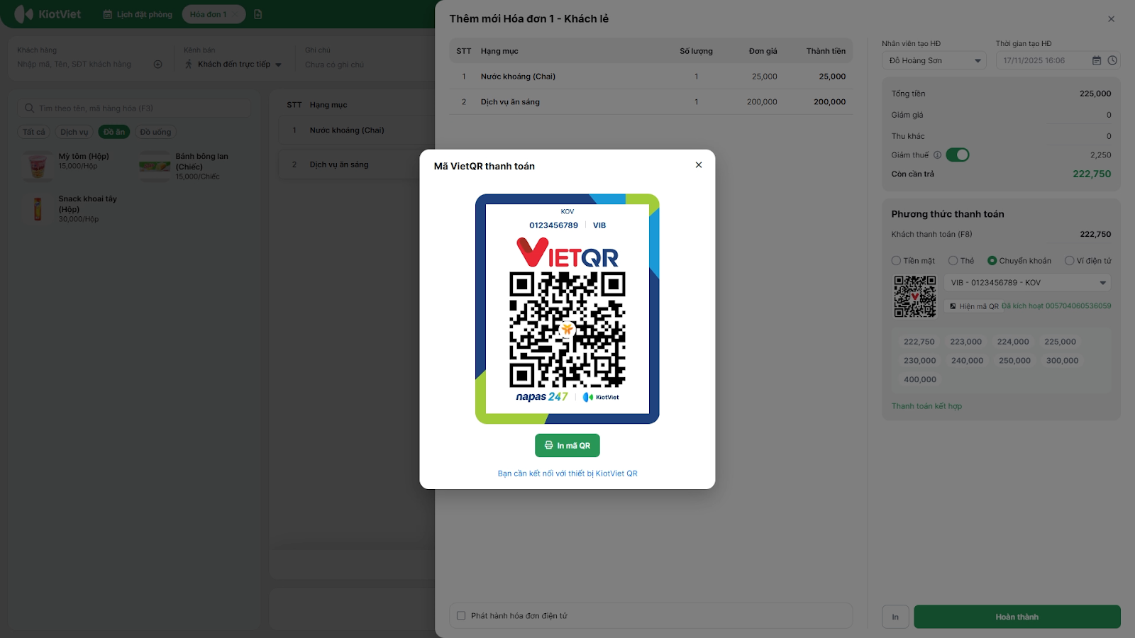 - Giải pháp: Bạn không cần kết nối với màn hình hiển thị QR vật lý. Ứng dụng KiotViet Hotel đã tích hợp sẵn tính năng hiển thị mã QR ngay trên màn hình điện thoại của nhân viên để khách hàng quét trực tiếp.