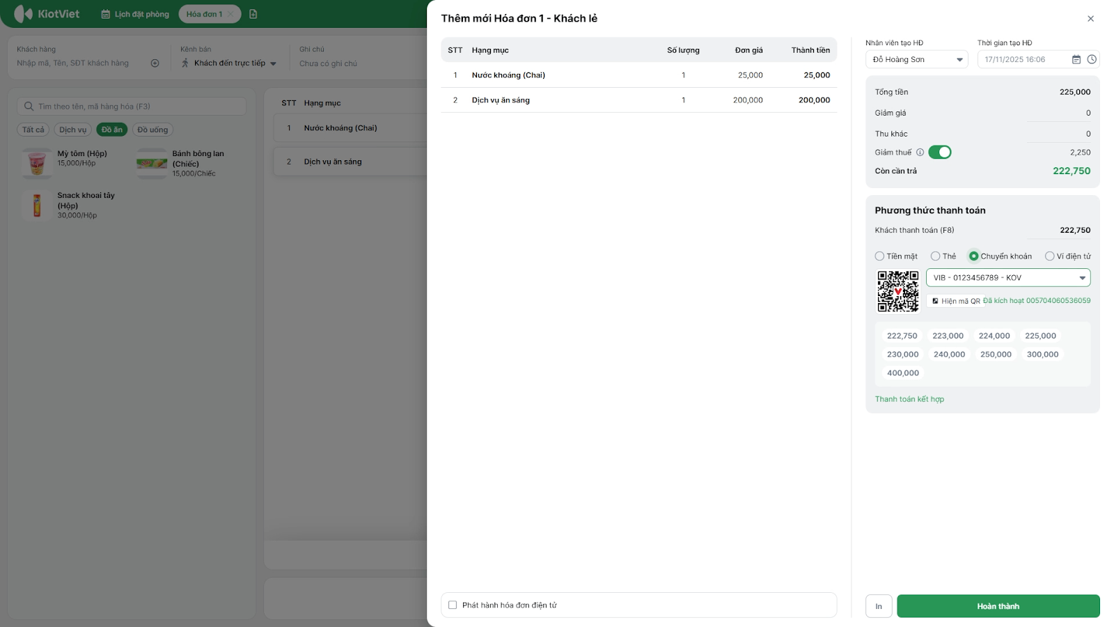 - Tình huống: Khi nhân viên lễ tân dùng ứng dụng KiotViet Hotel để tạo hóa đơn check-out cho khách và khách muốn thanh toán qua QR code.