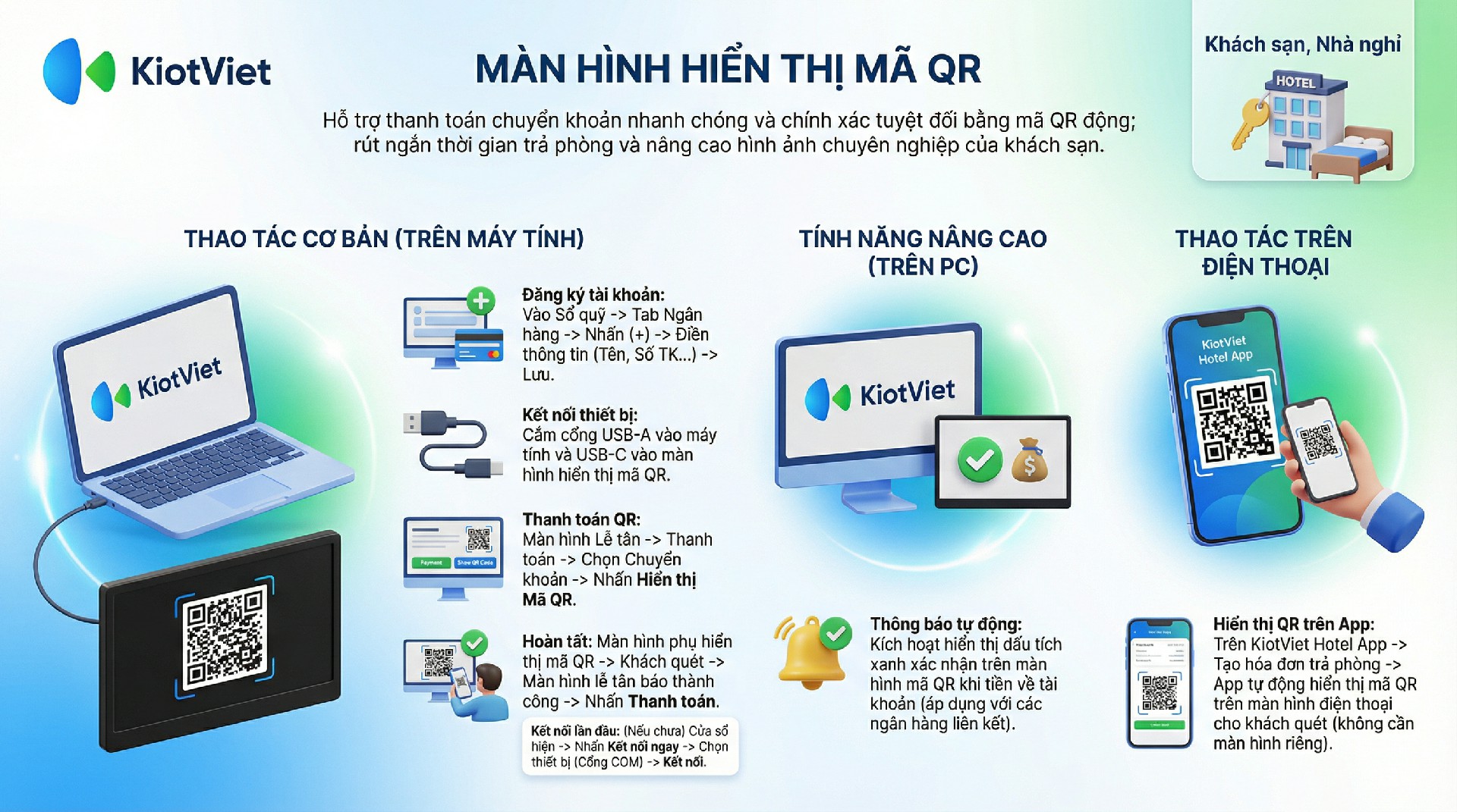 - Nâng cao tính chuyên nghiệp: Giúp khách sạn/nhà nghỉ tạo dựng hình ảnh hiện đại, ứng dụng công nghệ, mang lại trải nghiệm thanh toán tiện lợi và an toàn cho khách hàng.
