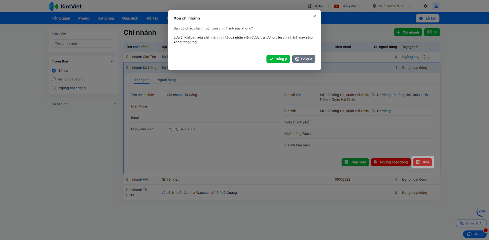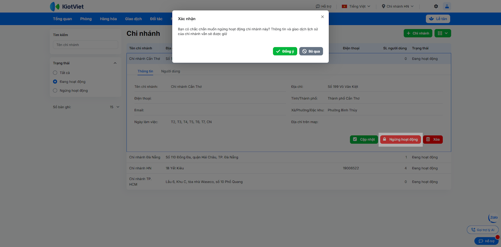 - Ngừng hoạt động: Chọn chi nhánh cần đóng, nhấn Ngừng hoạt động → xác nhận Đồng ý. Chi nhánh này sẽ không thể thực hiện giao dịch nhưng dữ liệu lịch sử vẫn được lưu trữ.