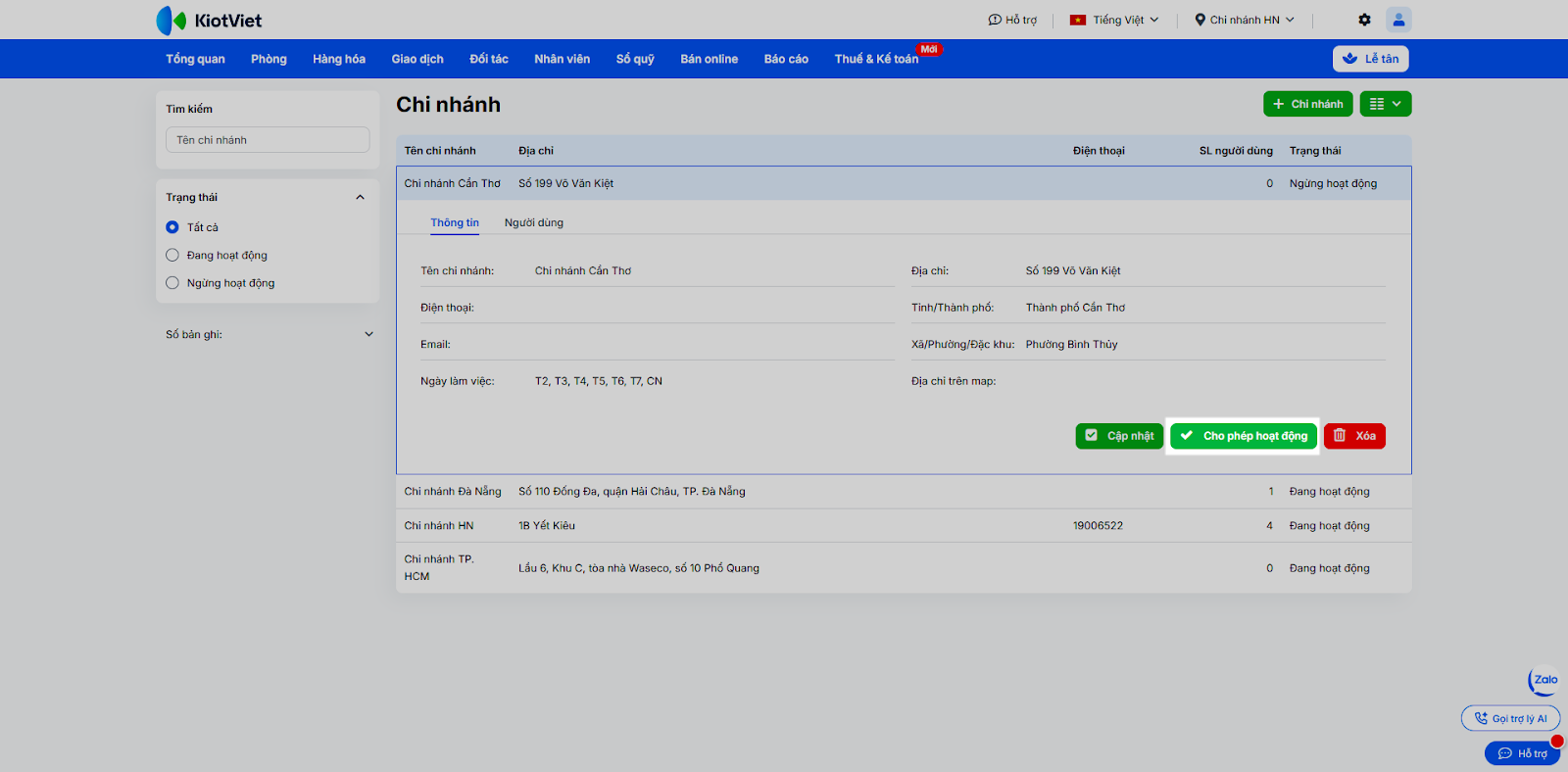- Cho phép hoạt động: Chọn chi nhánh đang ngừng, nhấn Cho phép hoạt động.