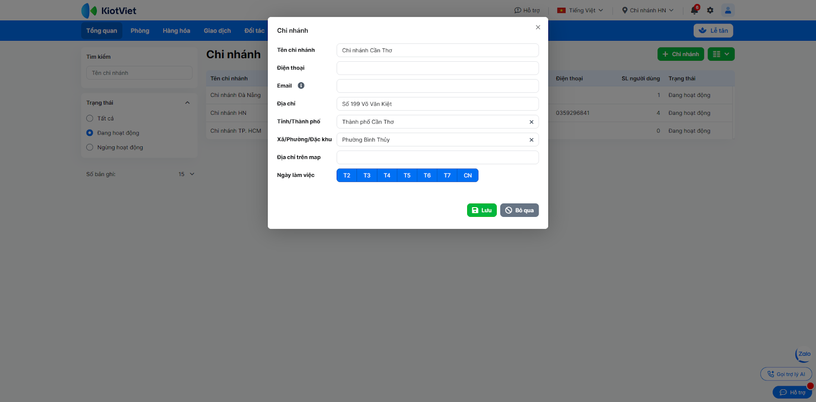 - Lưu ý: Hệ thống sẽ kiểm tra để đảm bảo tổng số chi nhánh đang hoạt động không vượt quá số lượng chi nhánh đã ký trong hợp đồng với KiotViet.